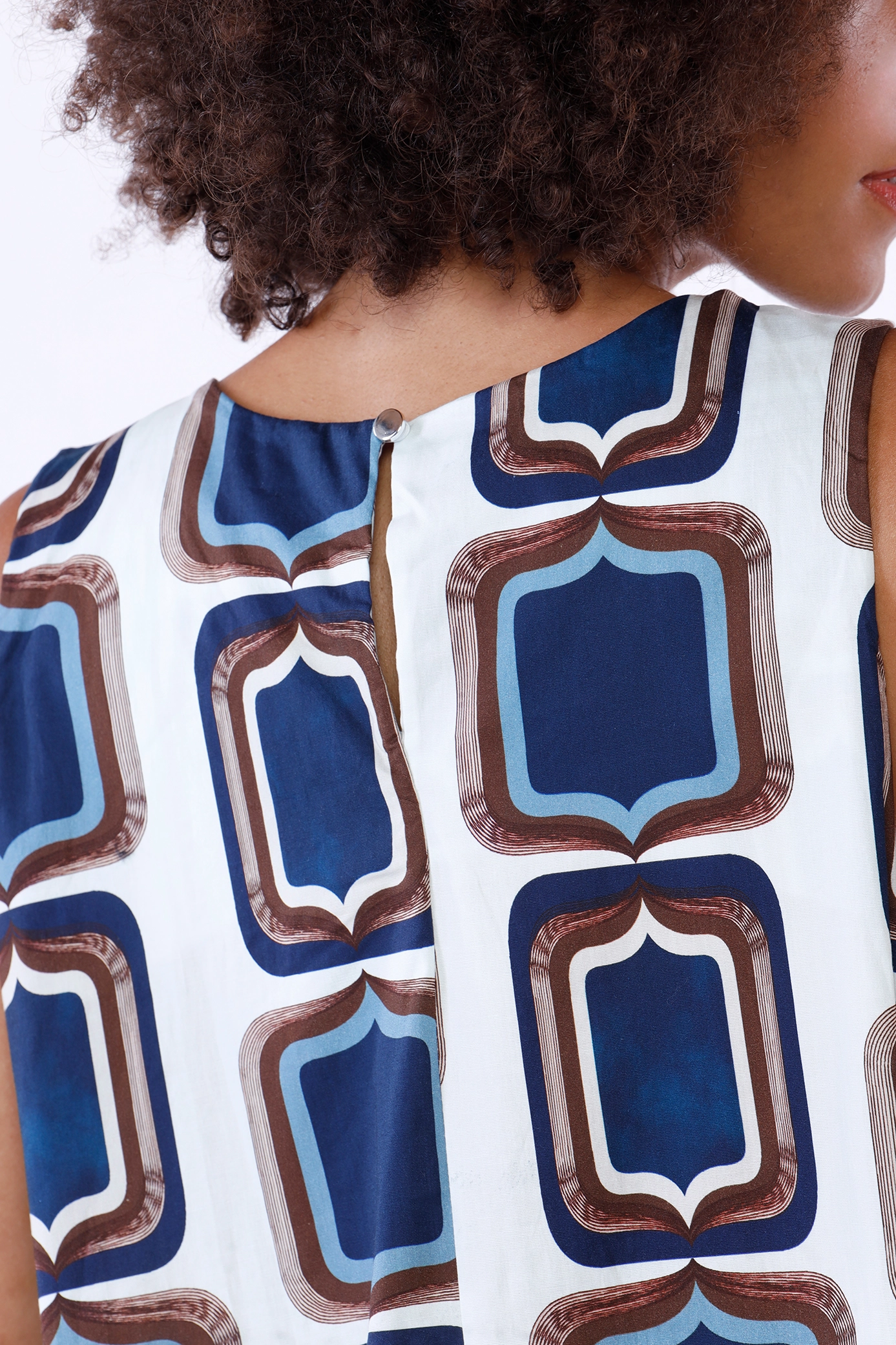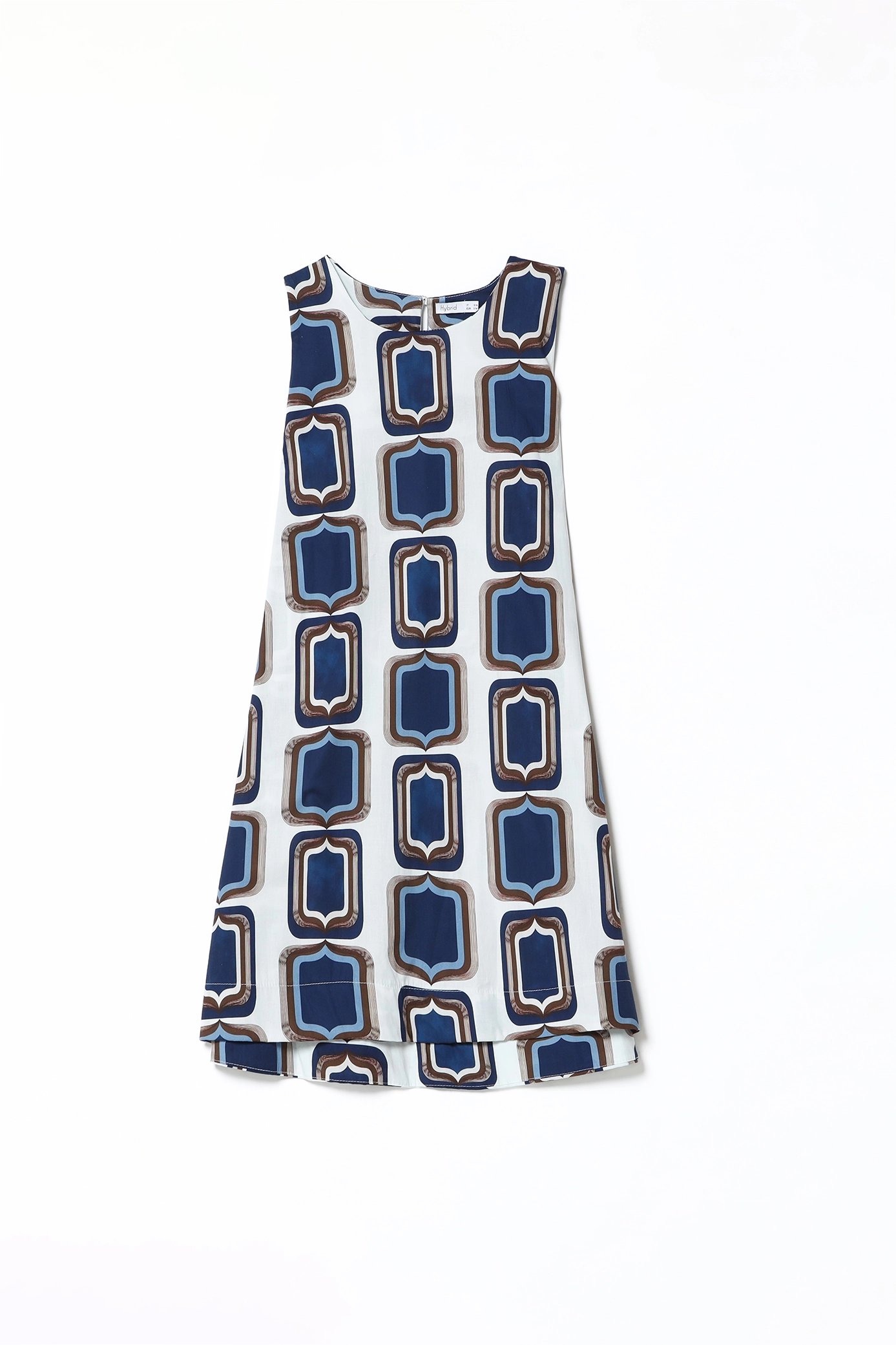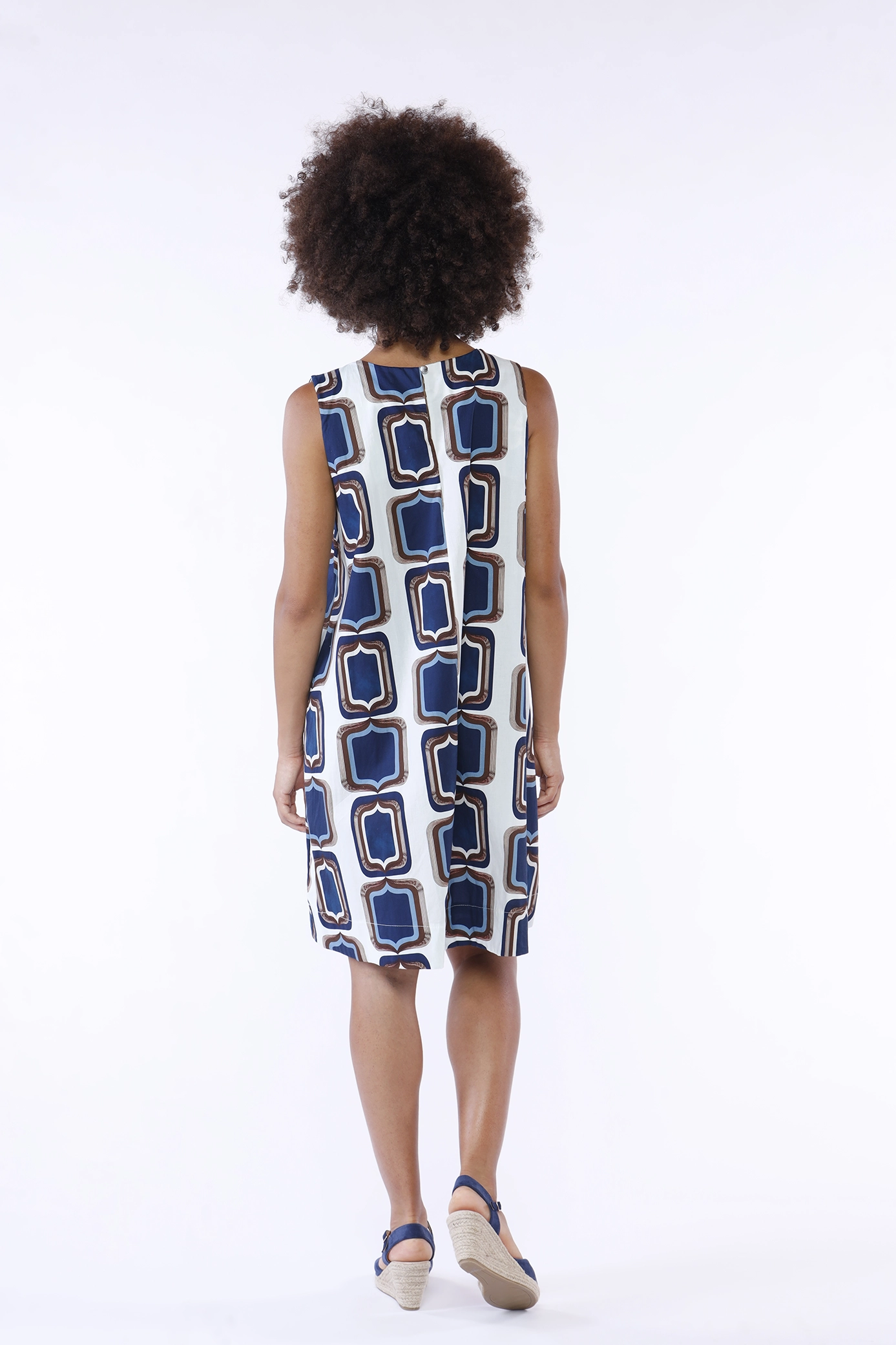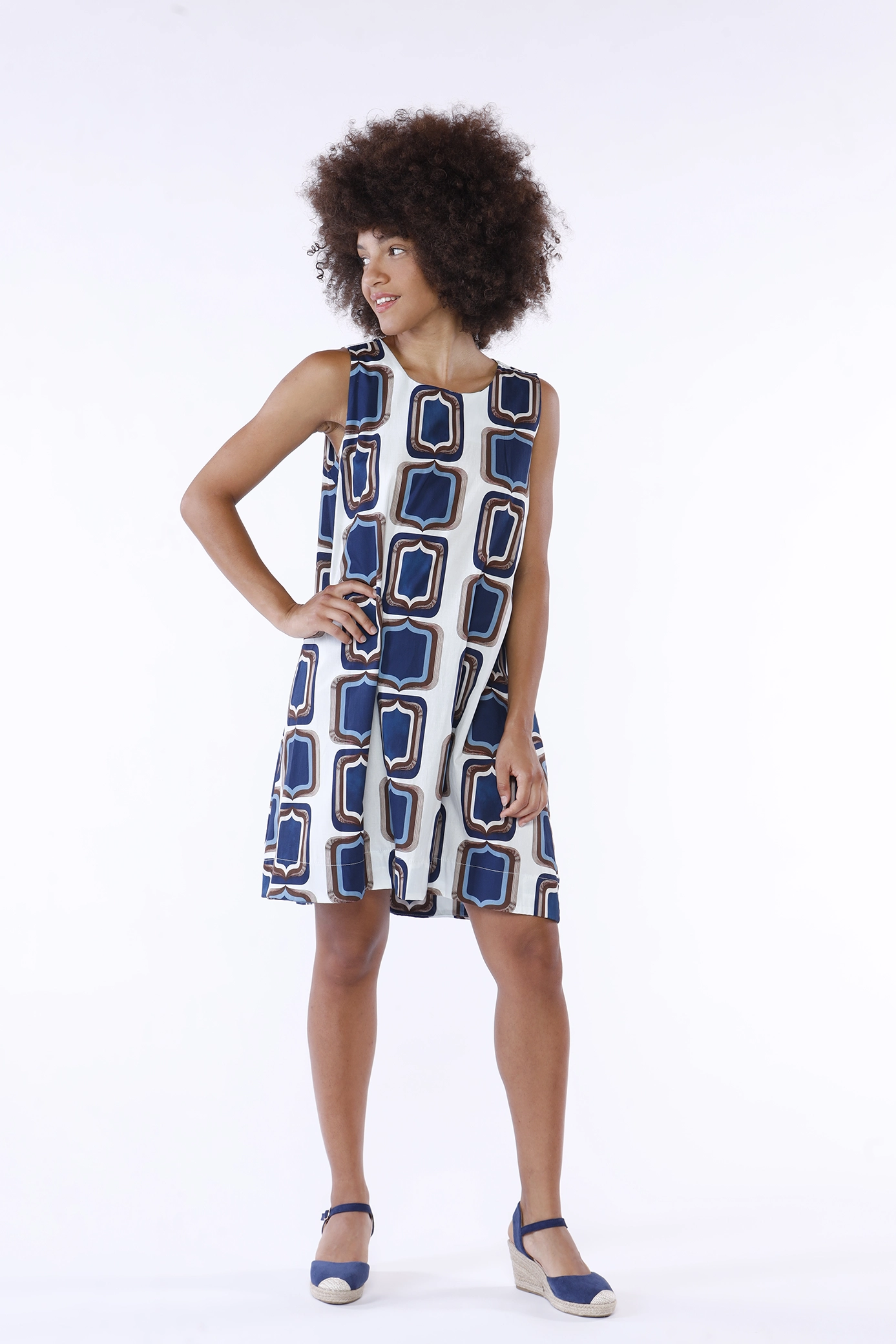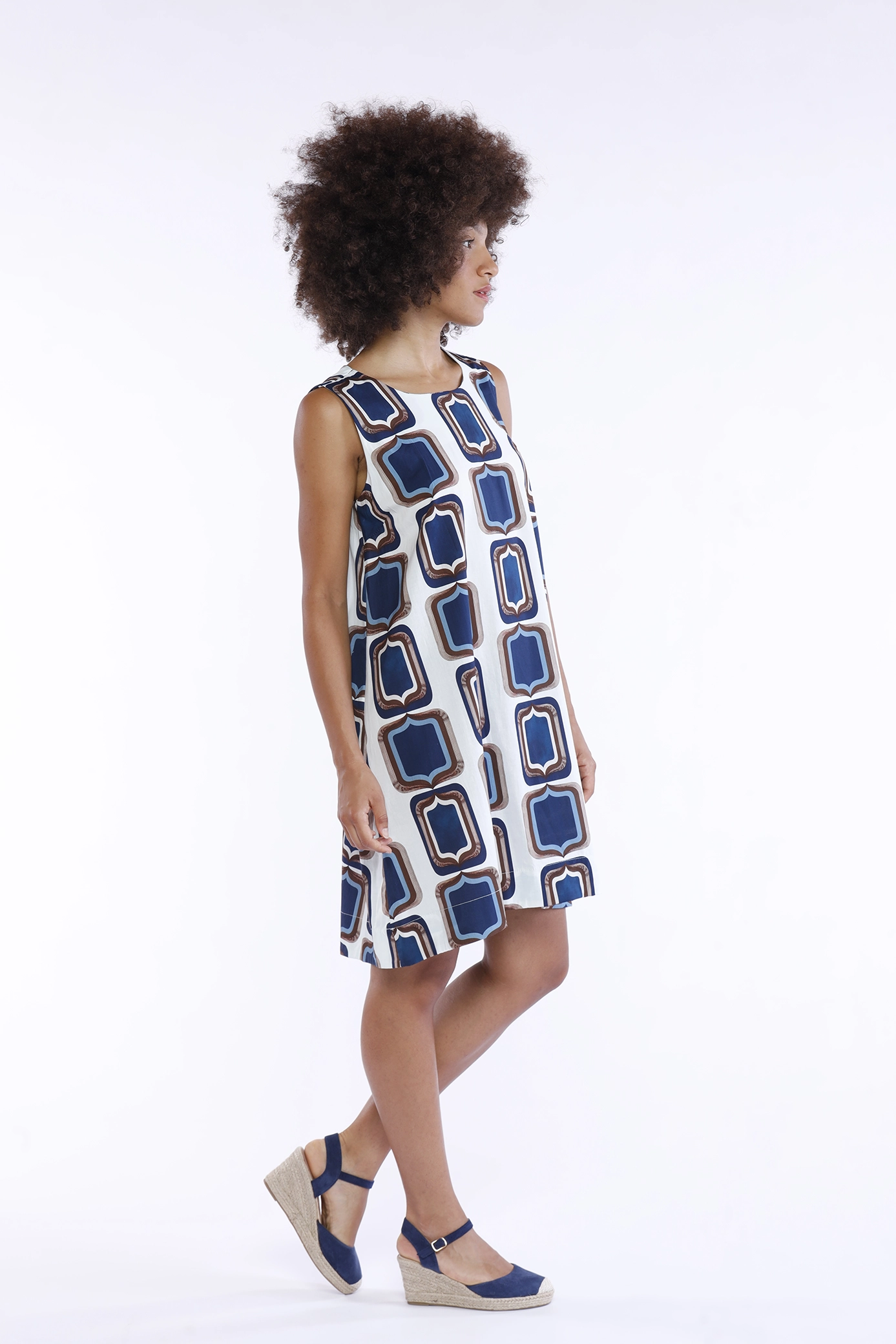 Abito corto smanicato in resco cotone, a fantasia geometrica