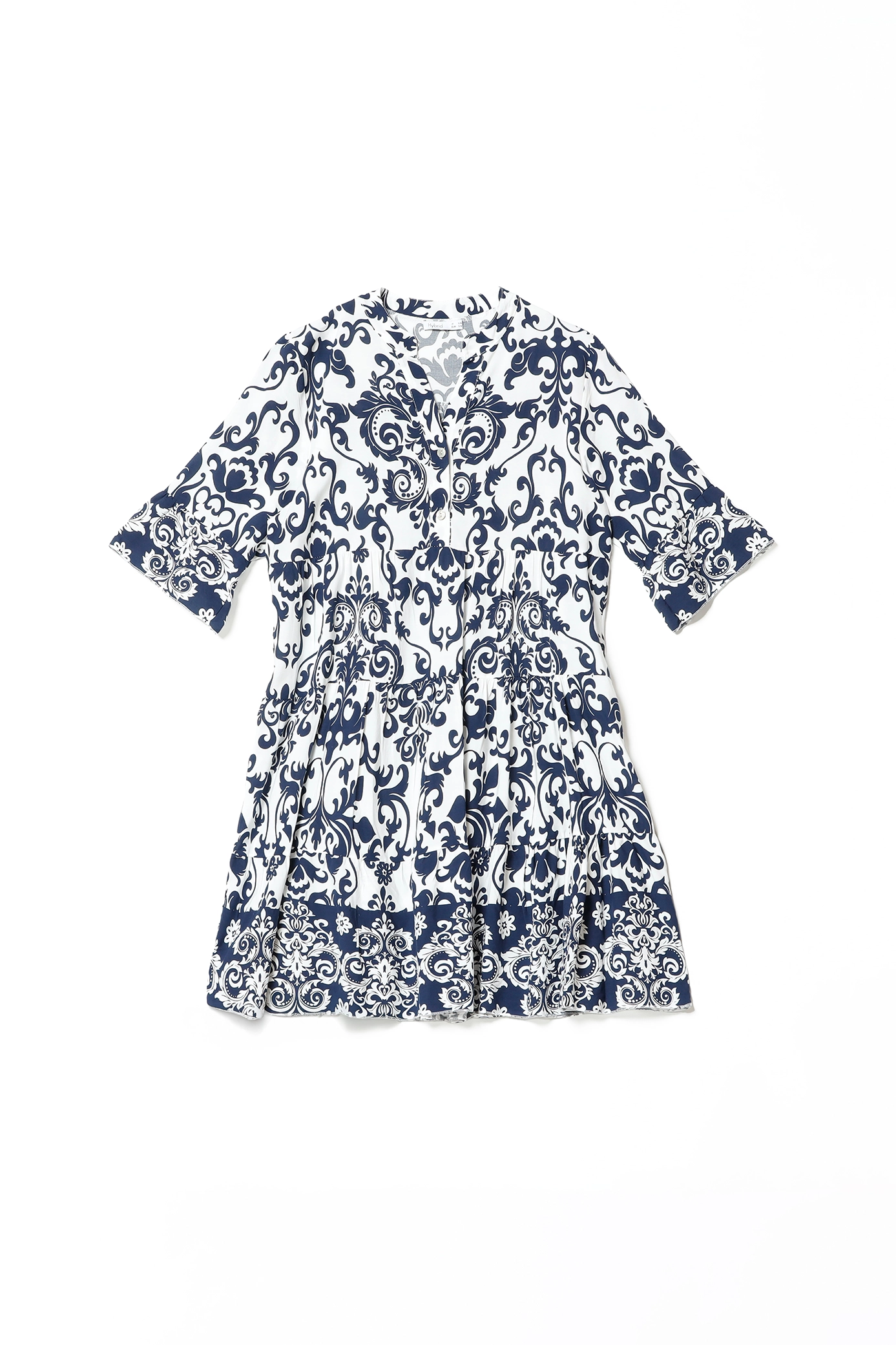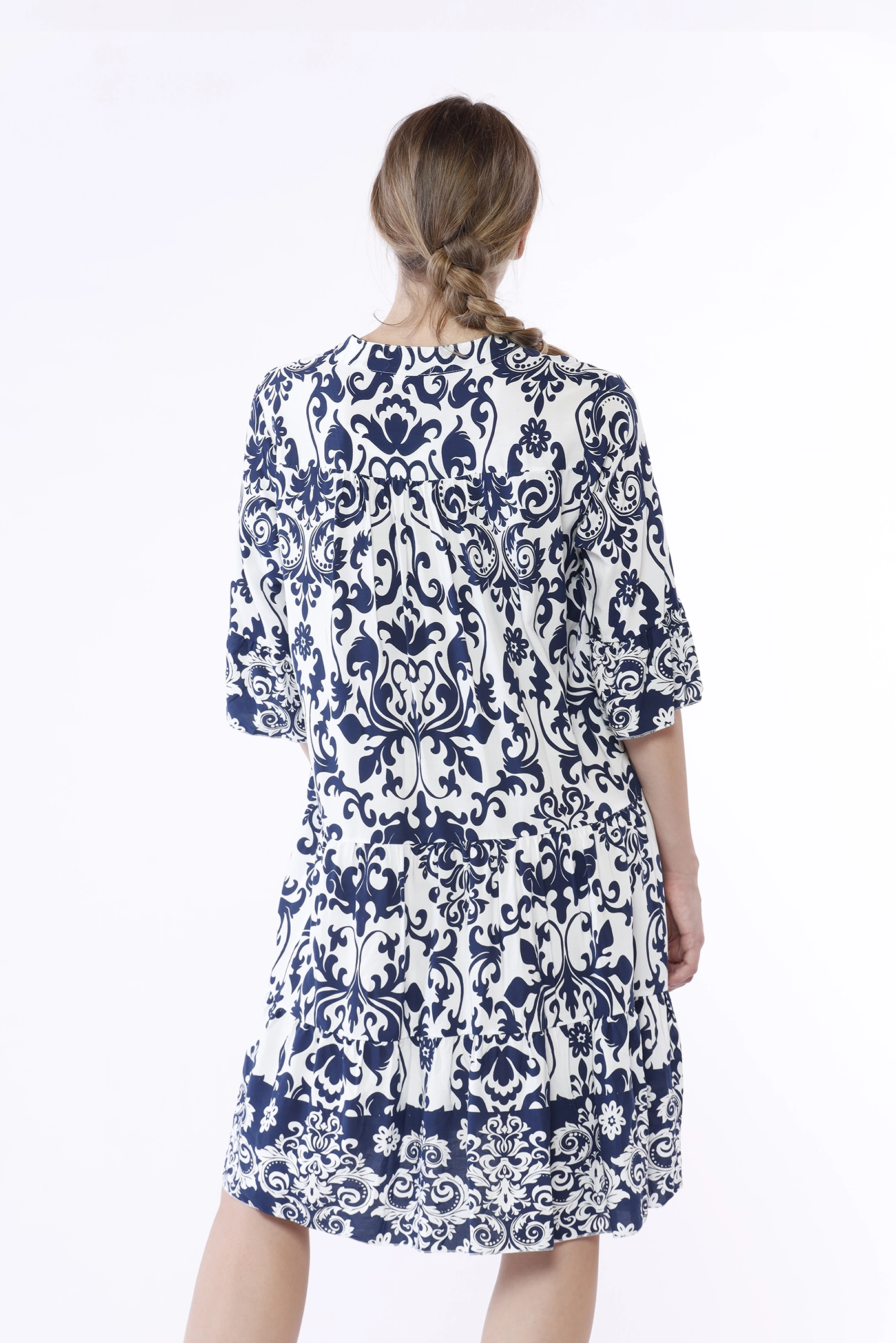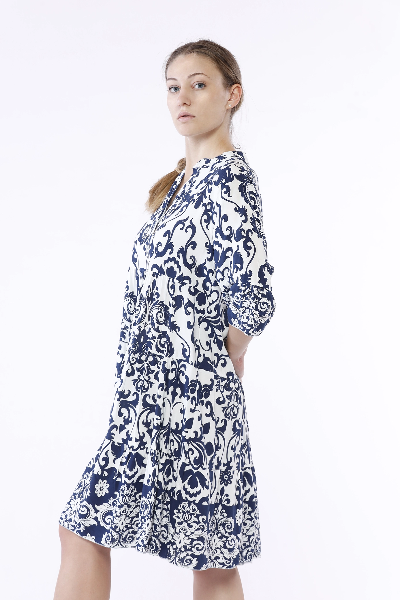 Abito chemisier fantasia, con gonna stratificata e maniche con orlo volant