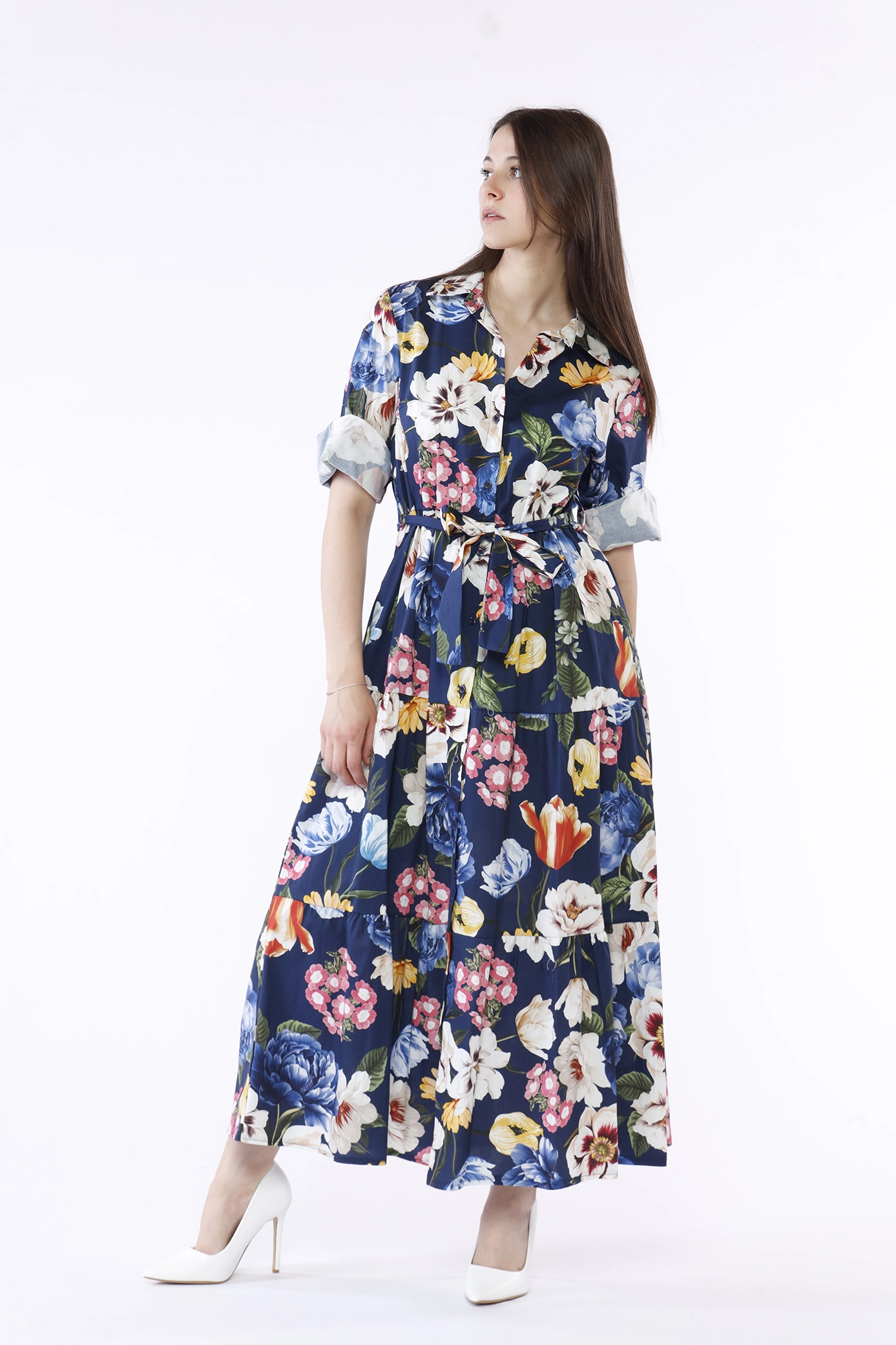 Abito chemisier a stampa di fiori variopinti, con gonna stratificata e graziosa cinta in vita