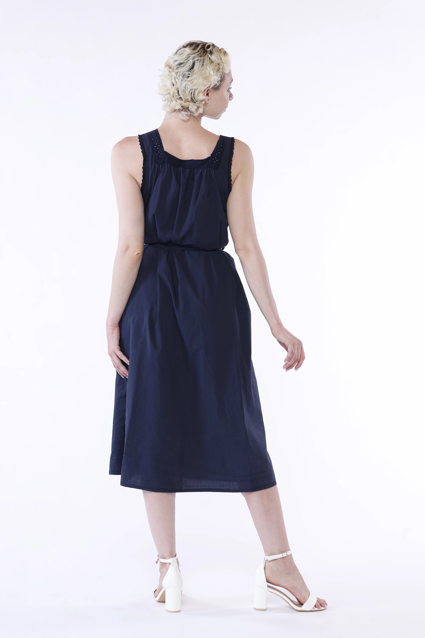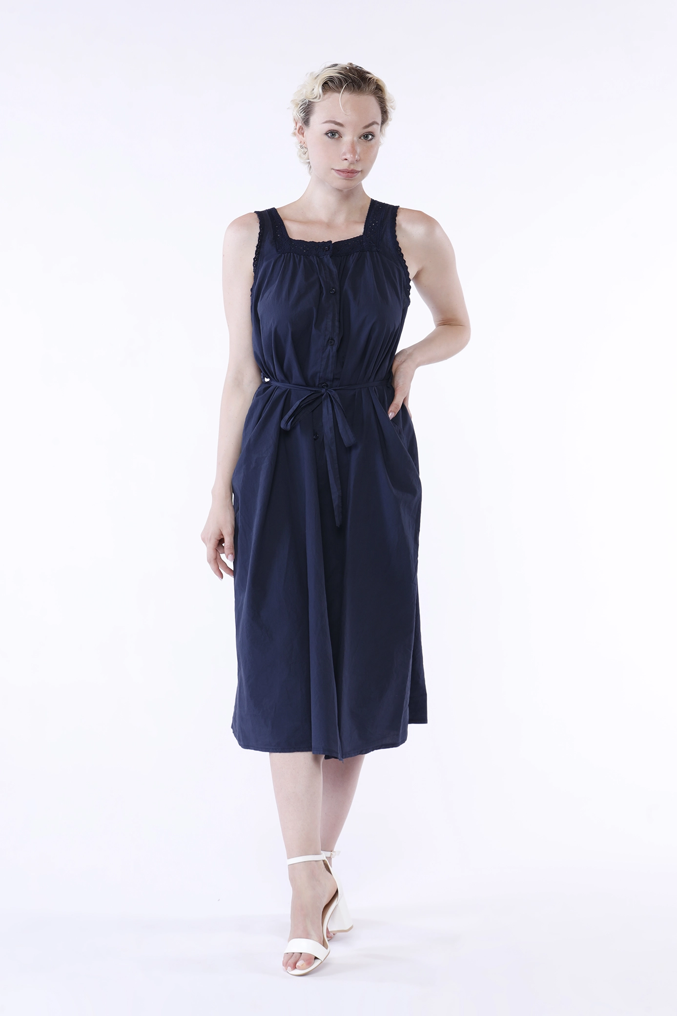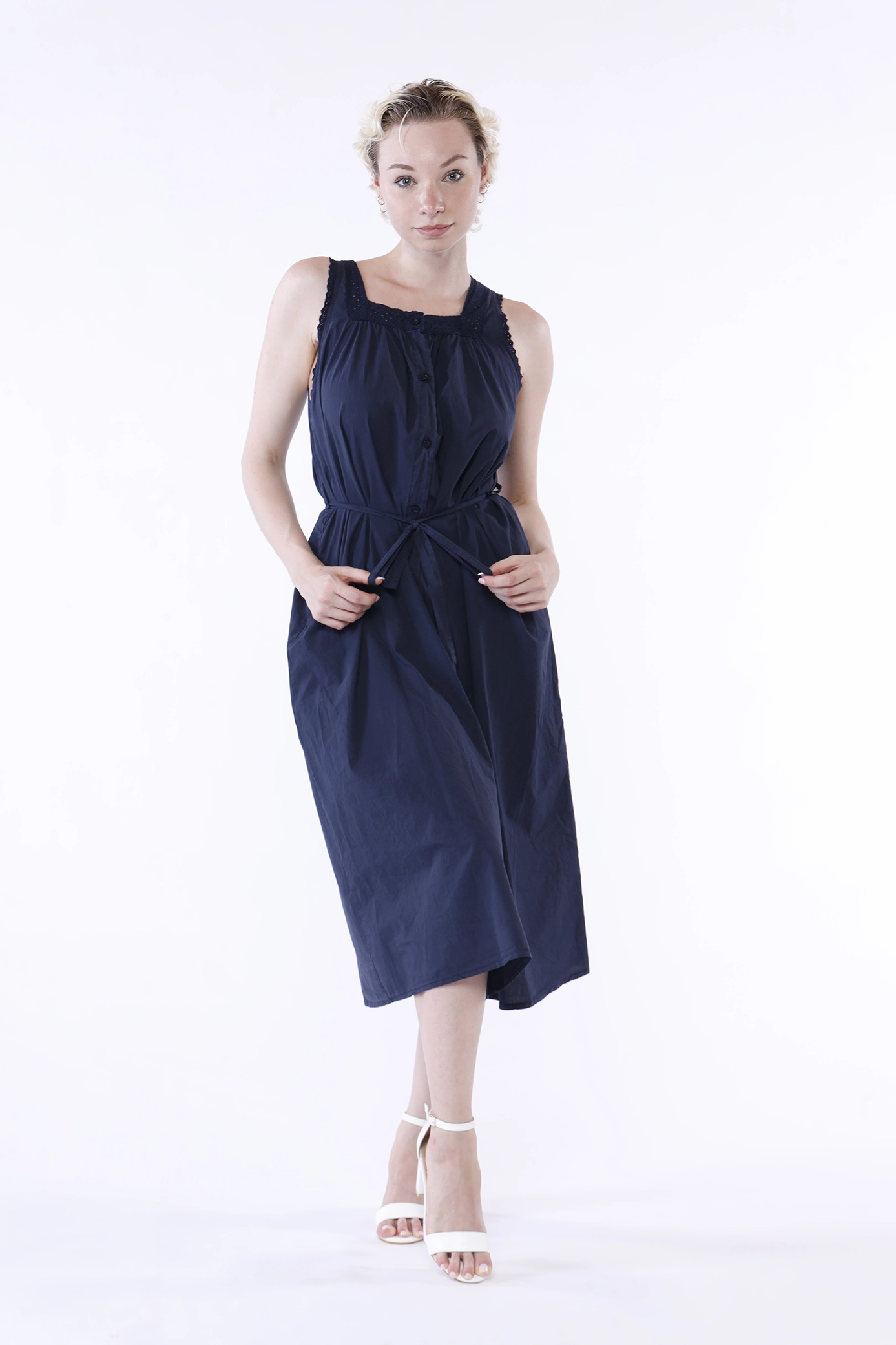 Abito chemisier smanicato, in fresco cotone, con inserti in pizzo e bottoni a tutta altezza