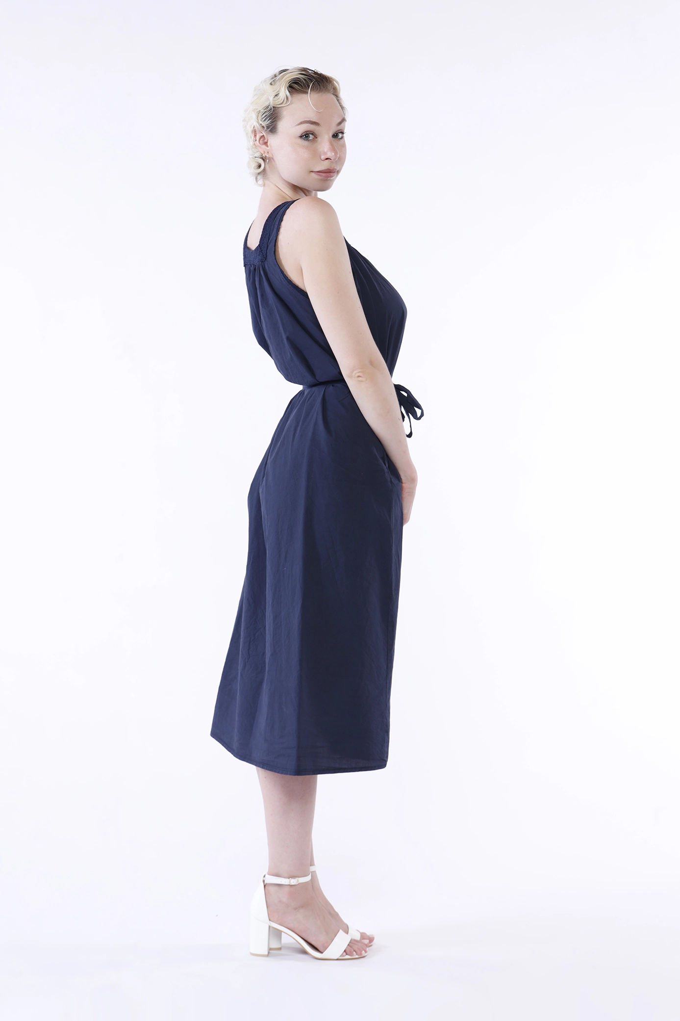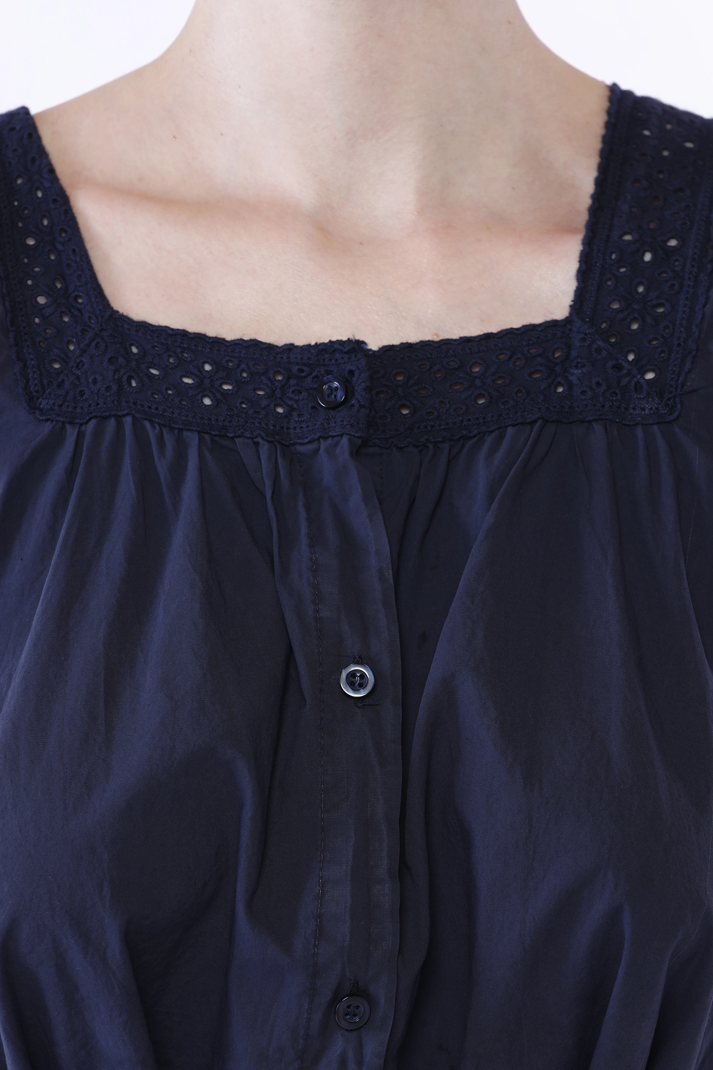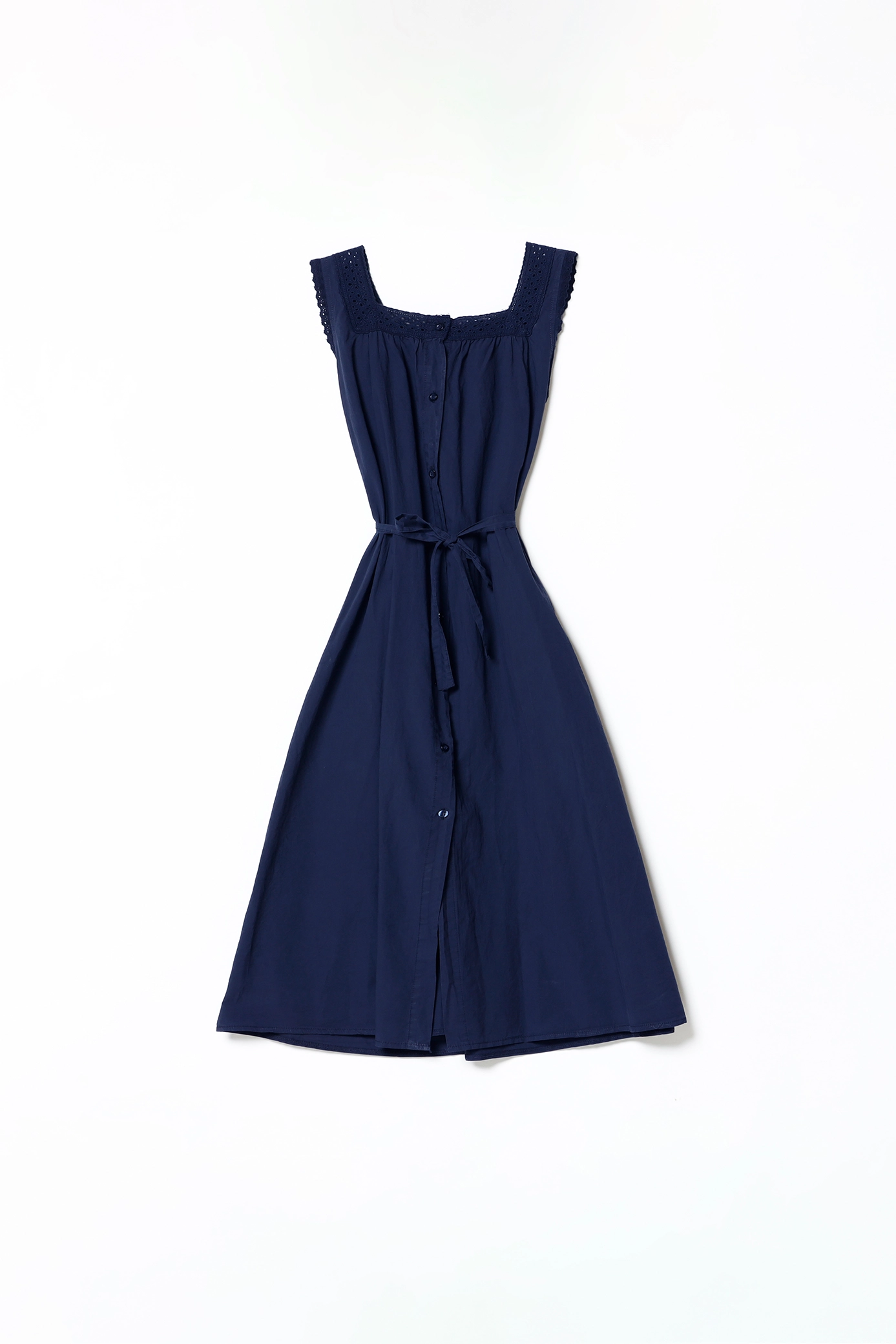 Abito chemisier smanicato, in fresco cotone, con inserti in pizzo e bottoni a tutta altezza
