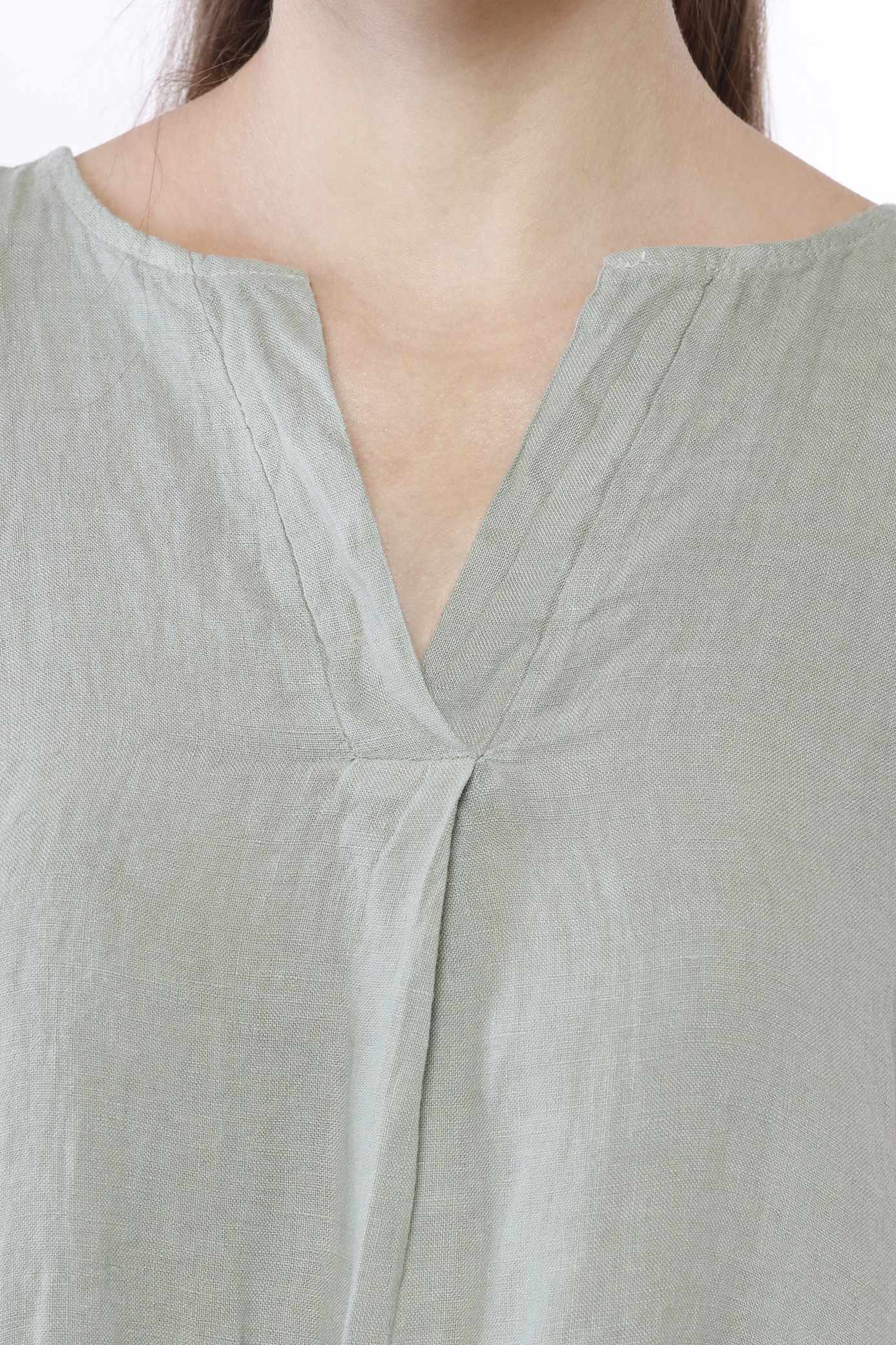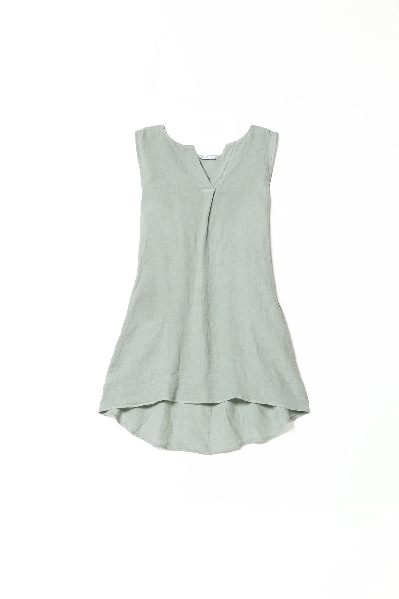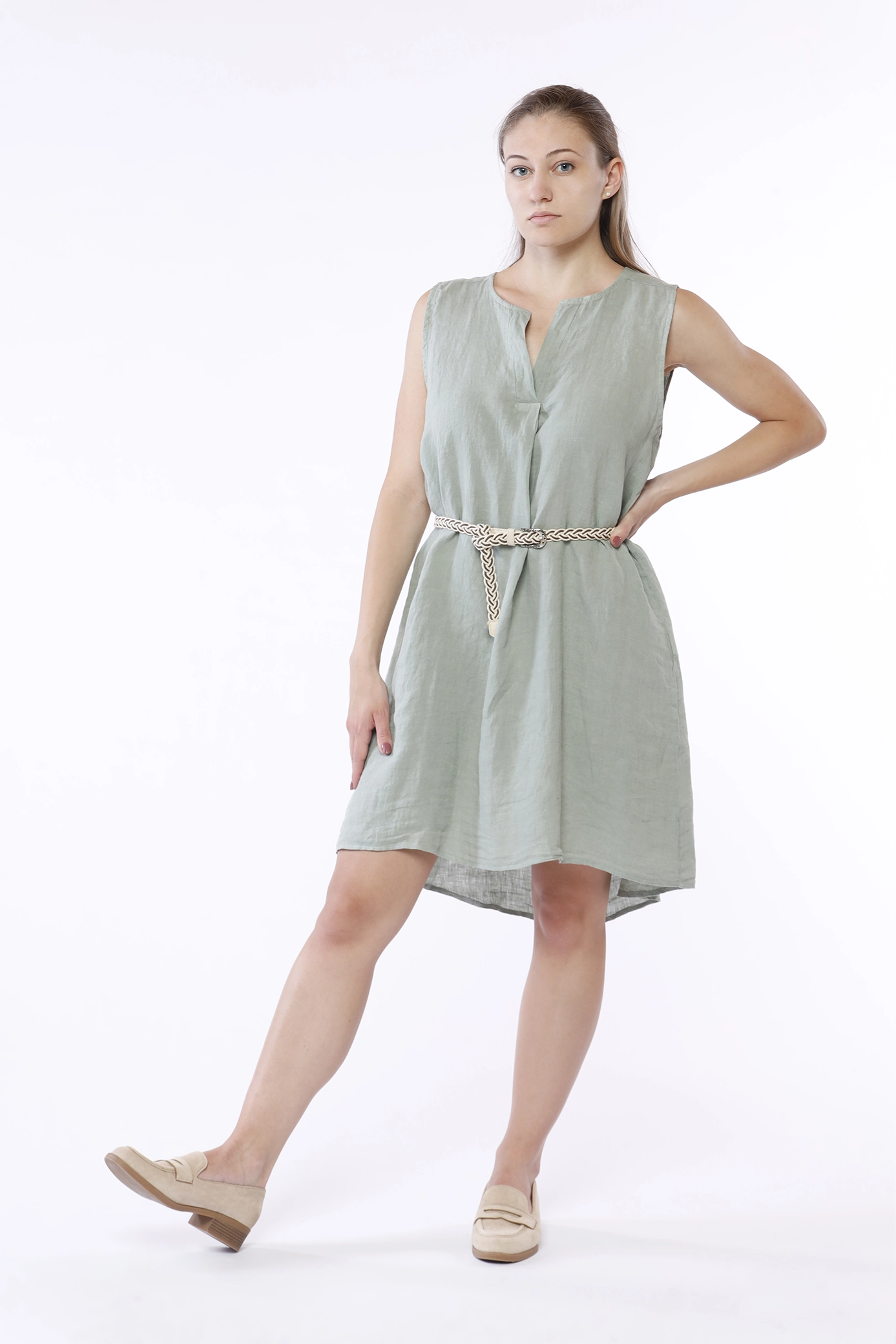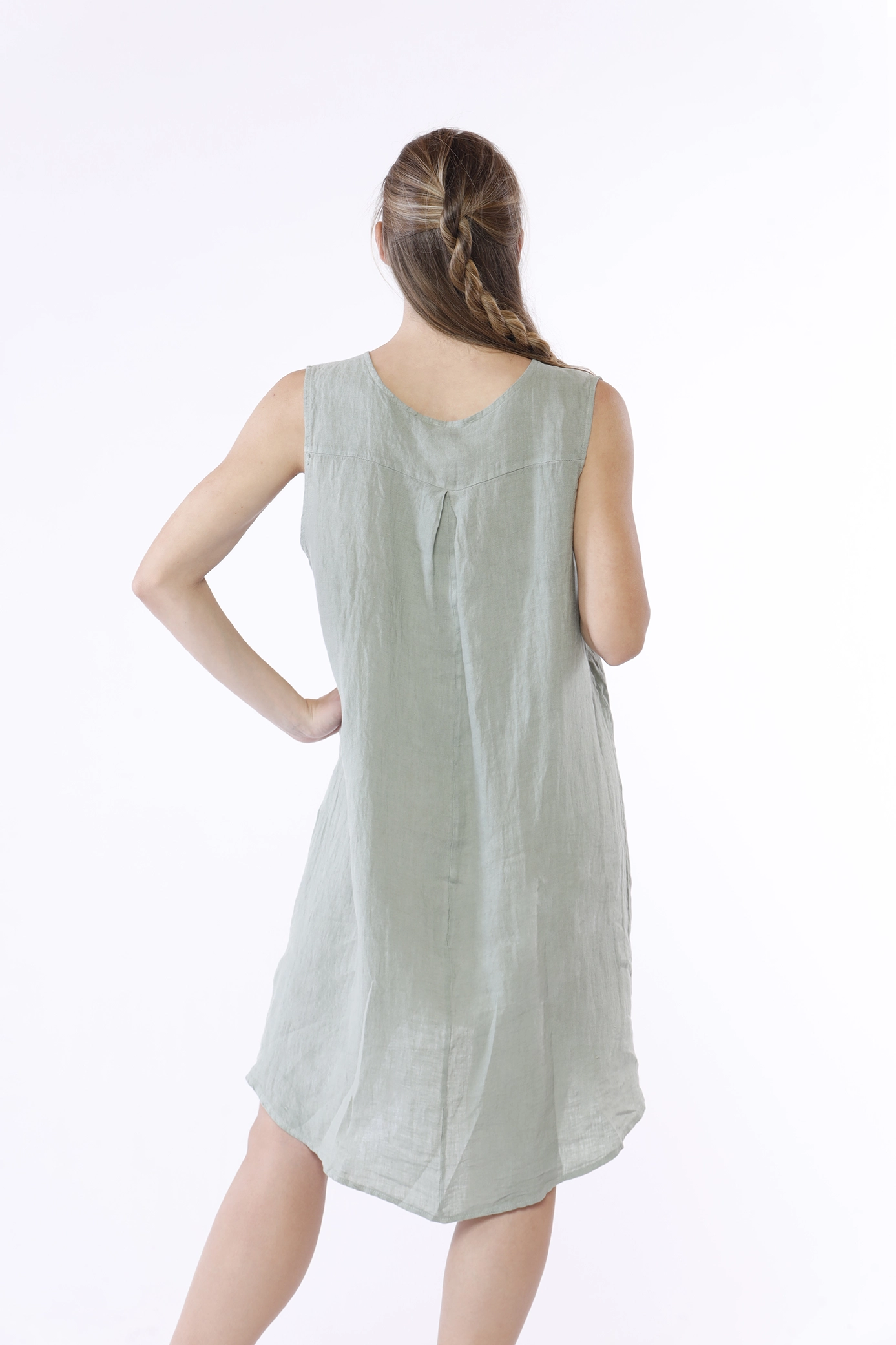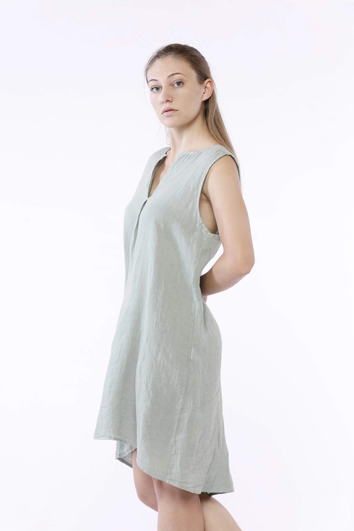 Abito corto smanicato, in fresco lino e con scollo tagliato a V sul davanti