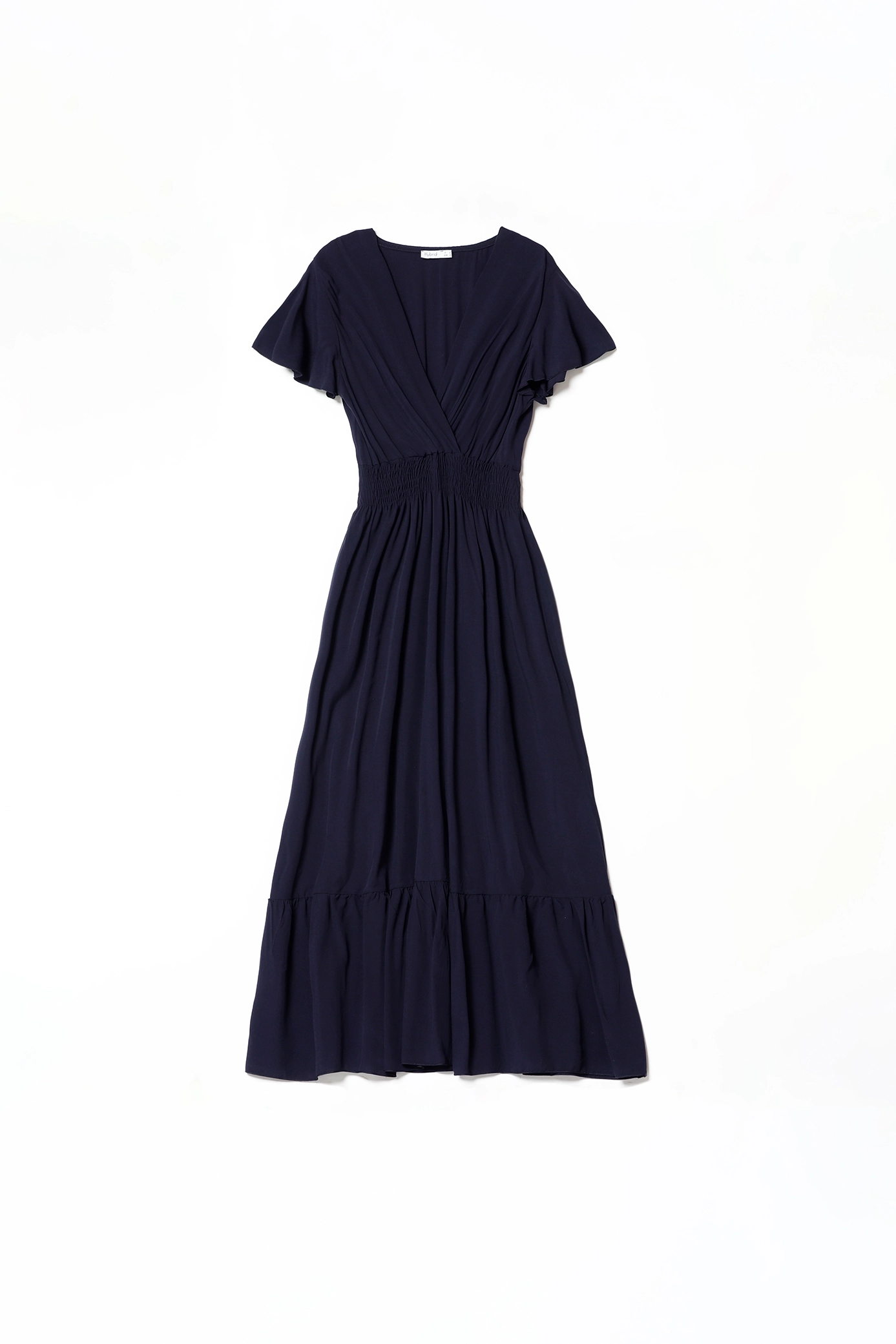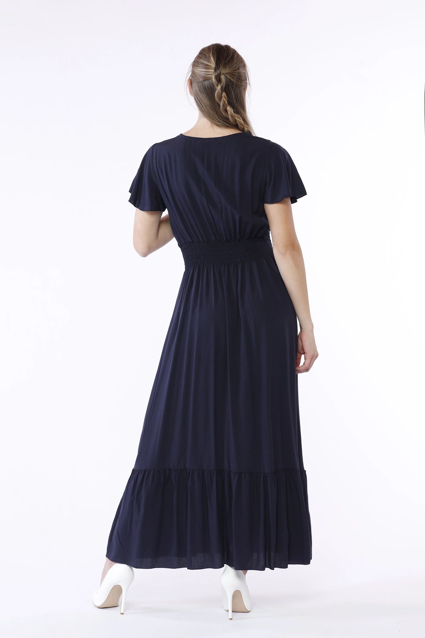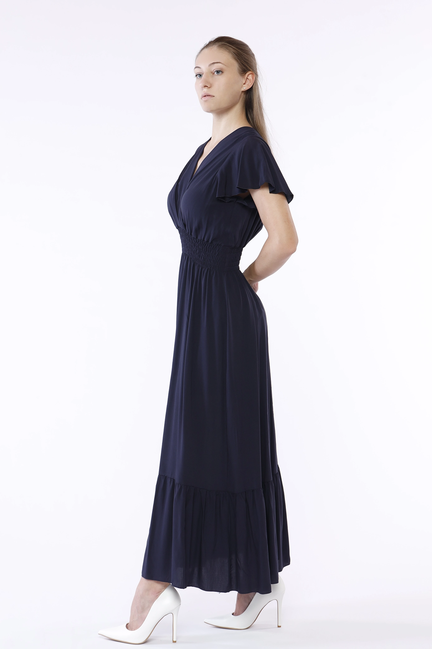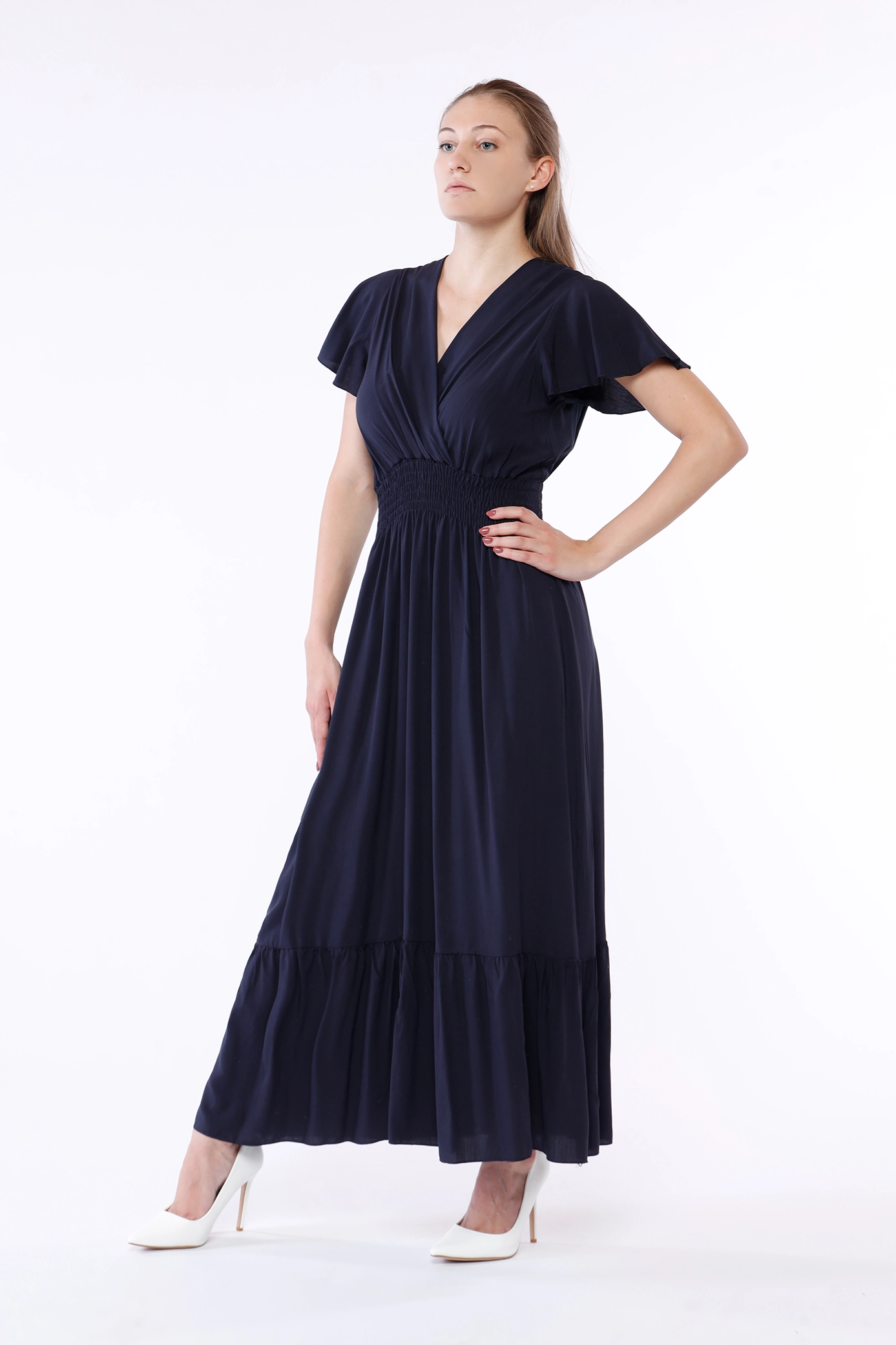 Abito lungo con ampio scollo a V e gonna stratificata a sbuffo, eleganti maniche volant ed elastico arricciato in vita
