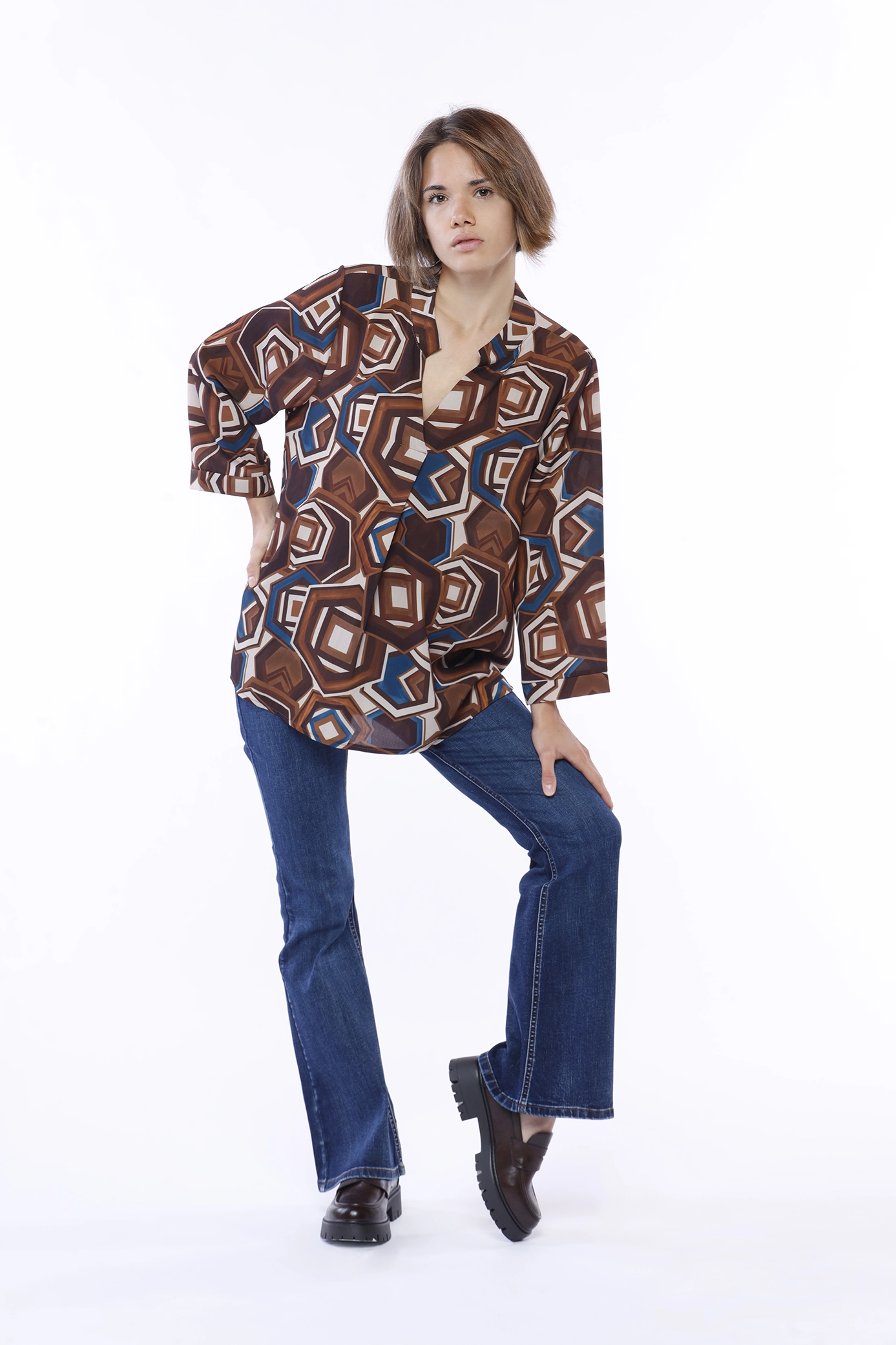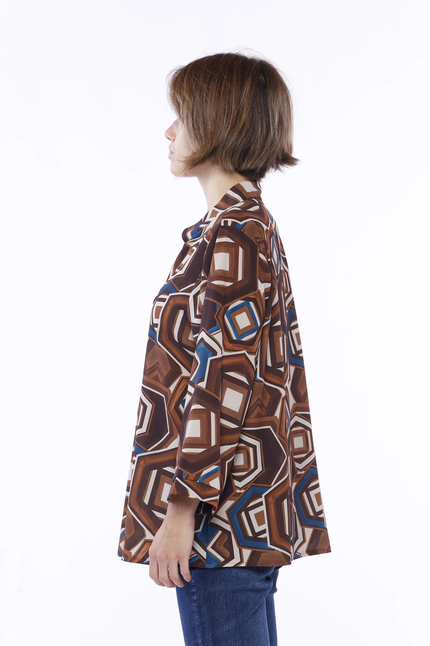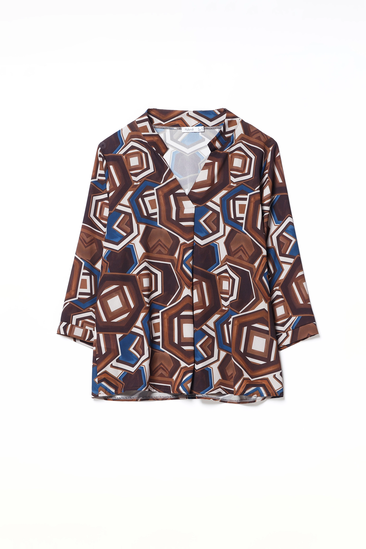 Blusa ampia a fantasia geometrica, con scollo alla coreana aperto a V e maniche a tre quarti