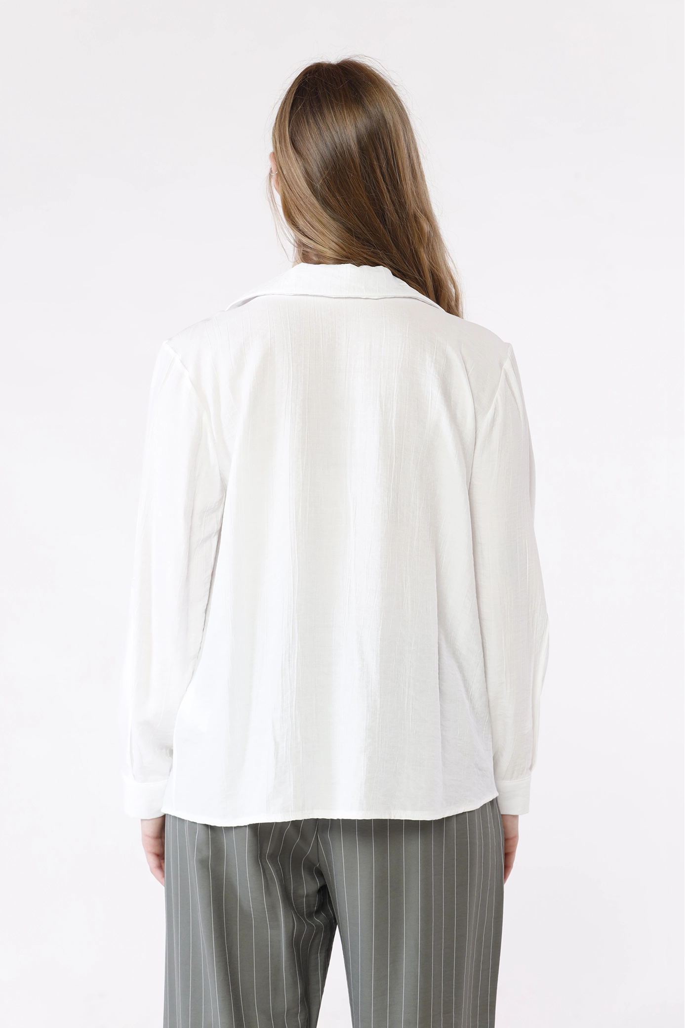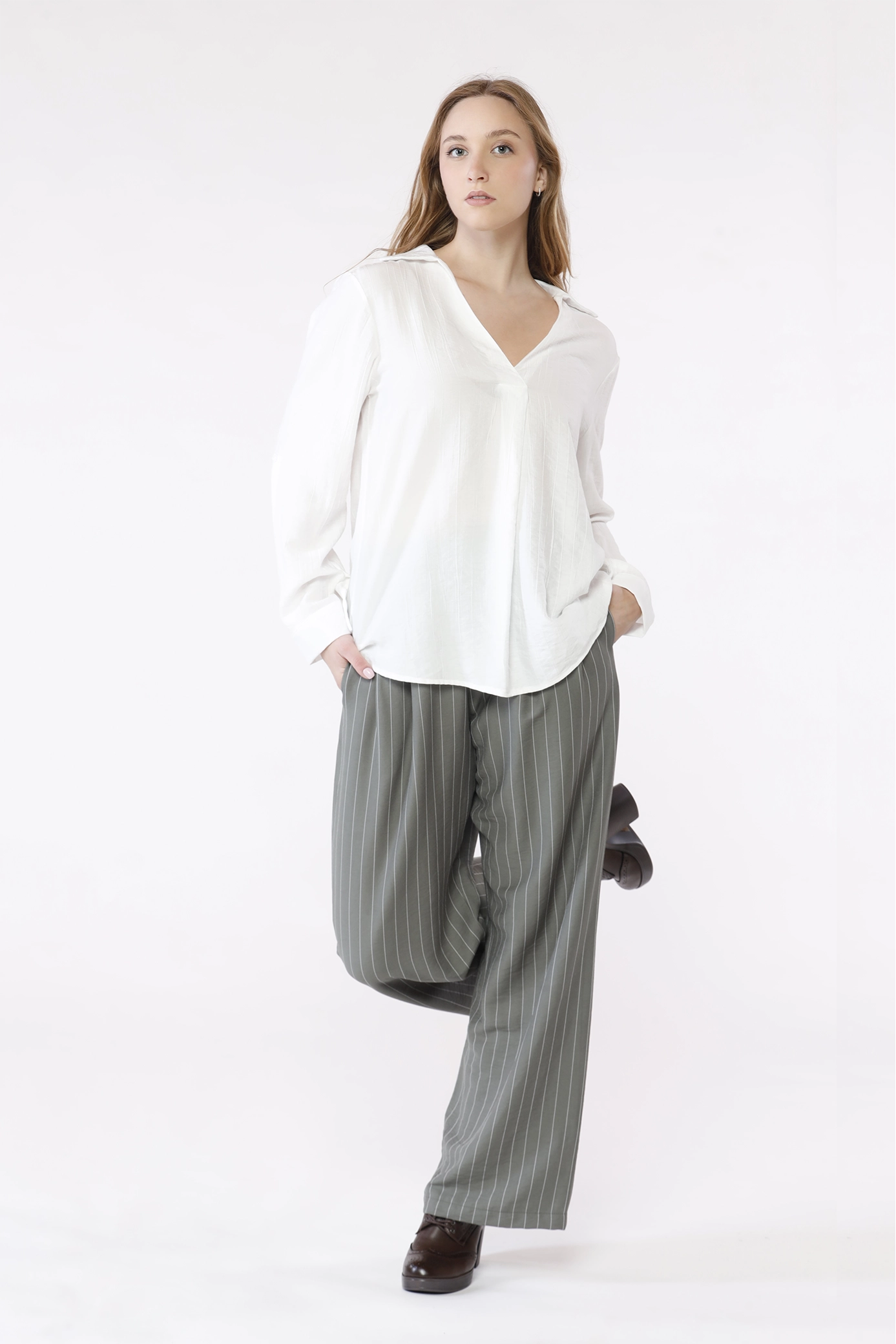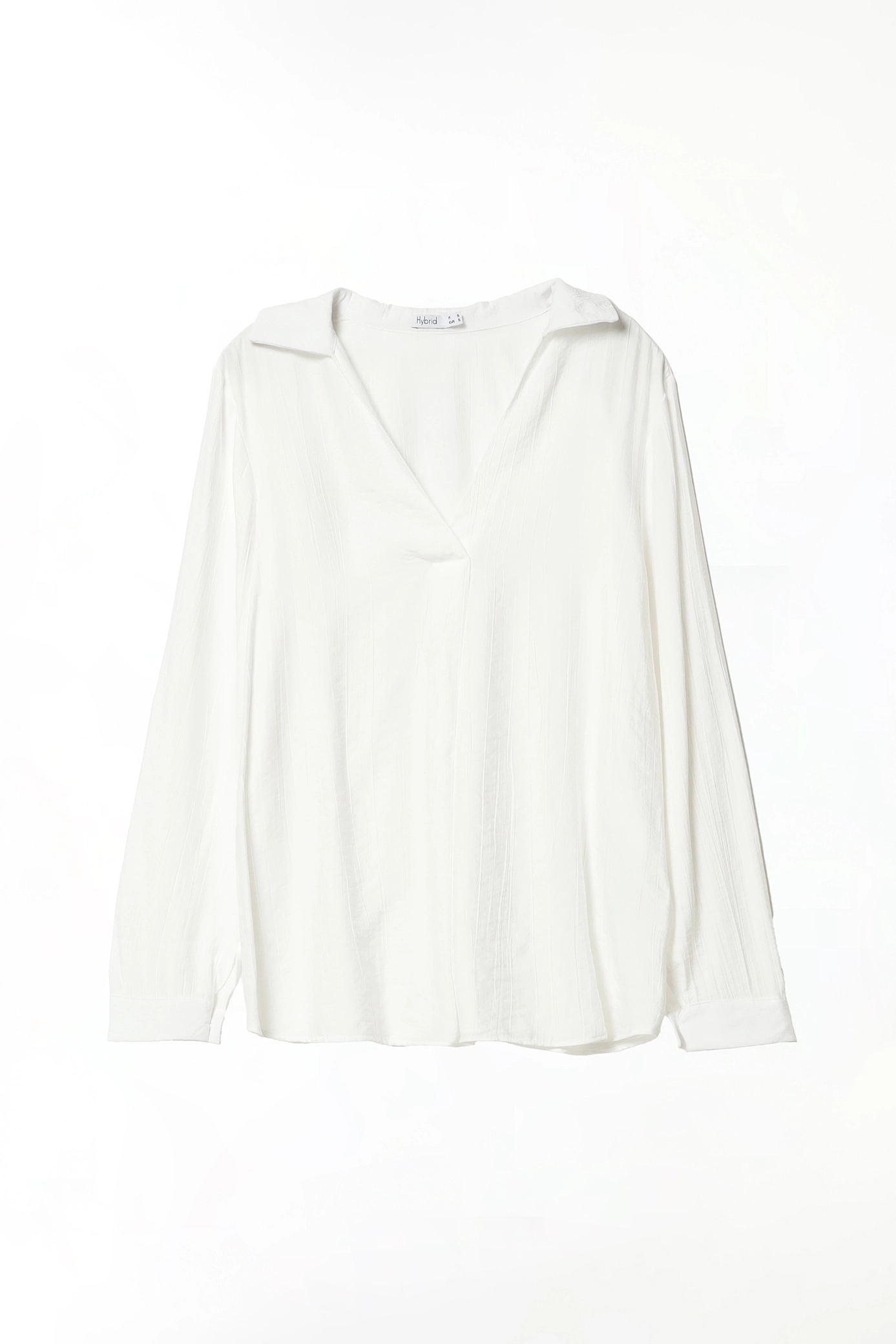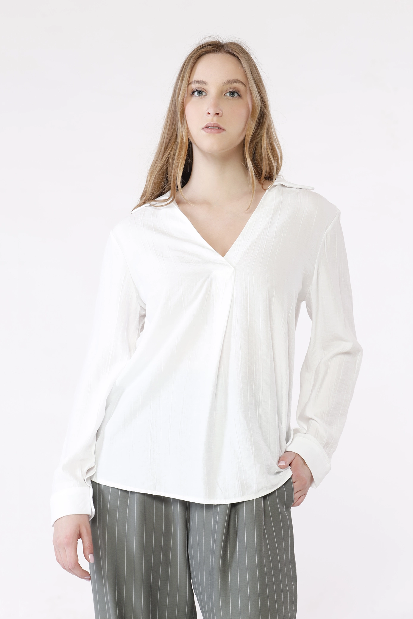 Blusa a manica lunga risvoltabile, con colletto alla francese aperto a V sul davanti