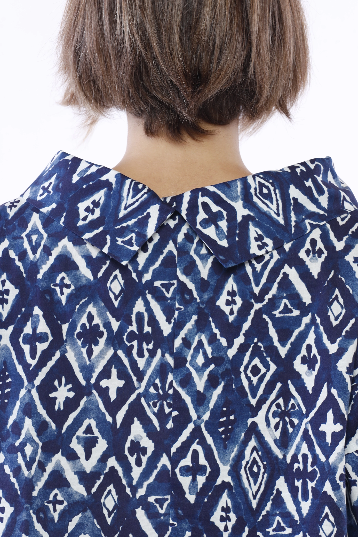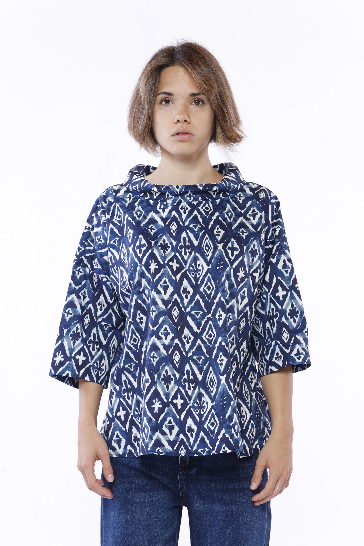 Blusa ampia casual, a fantasia di rombi, con maniche a kimono e scollo a barca risvoltato