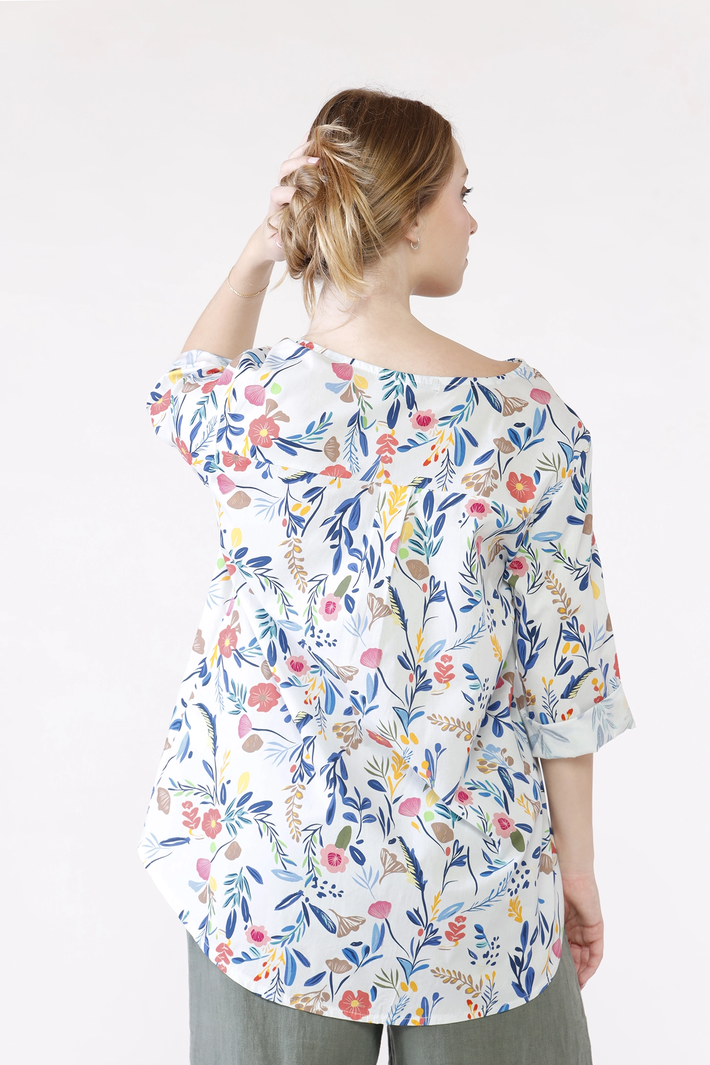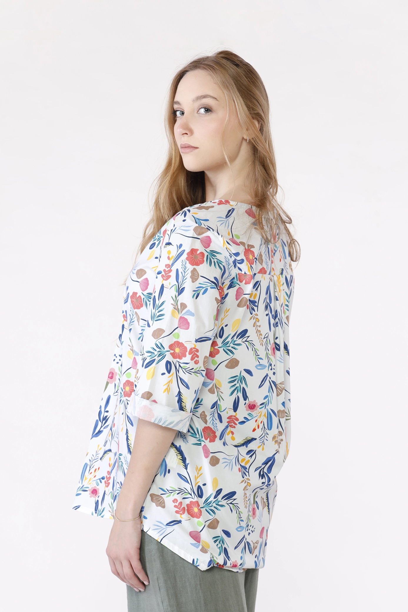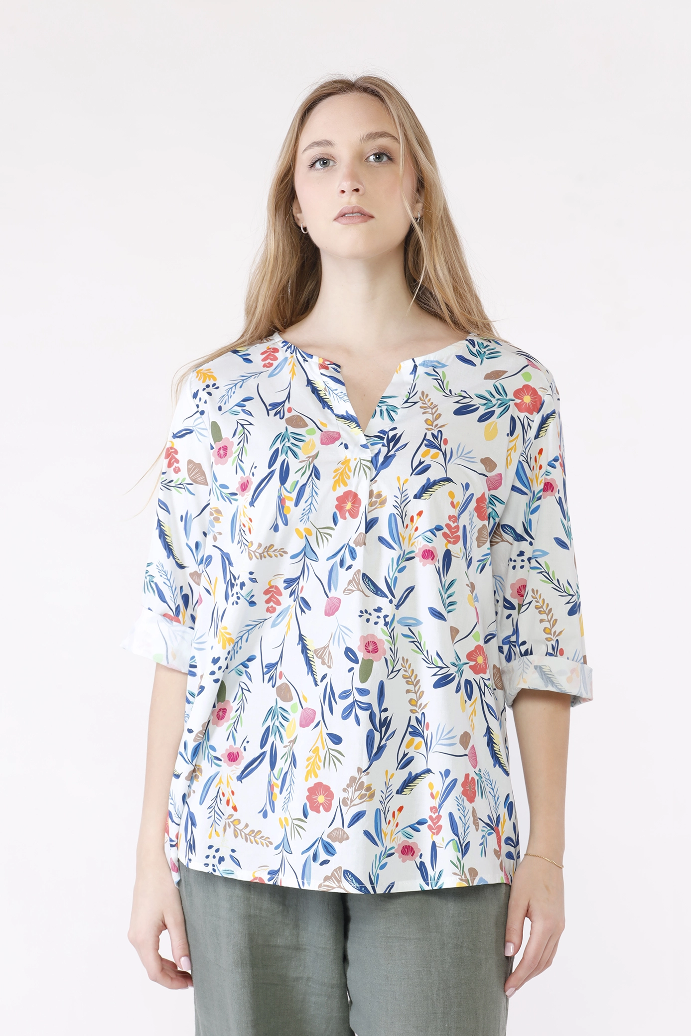 Blusa fantasia floreale, con manica a tre quarti e colletto alla coreana aperto sul davanti