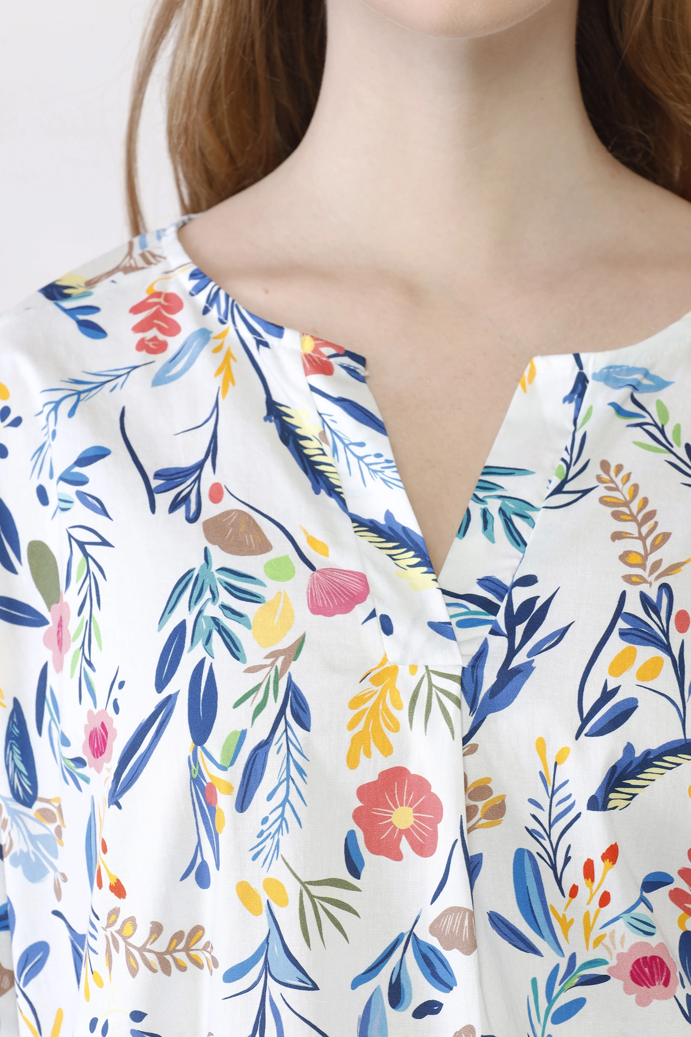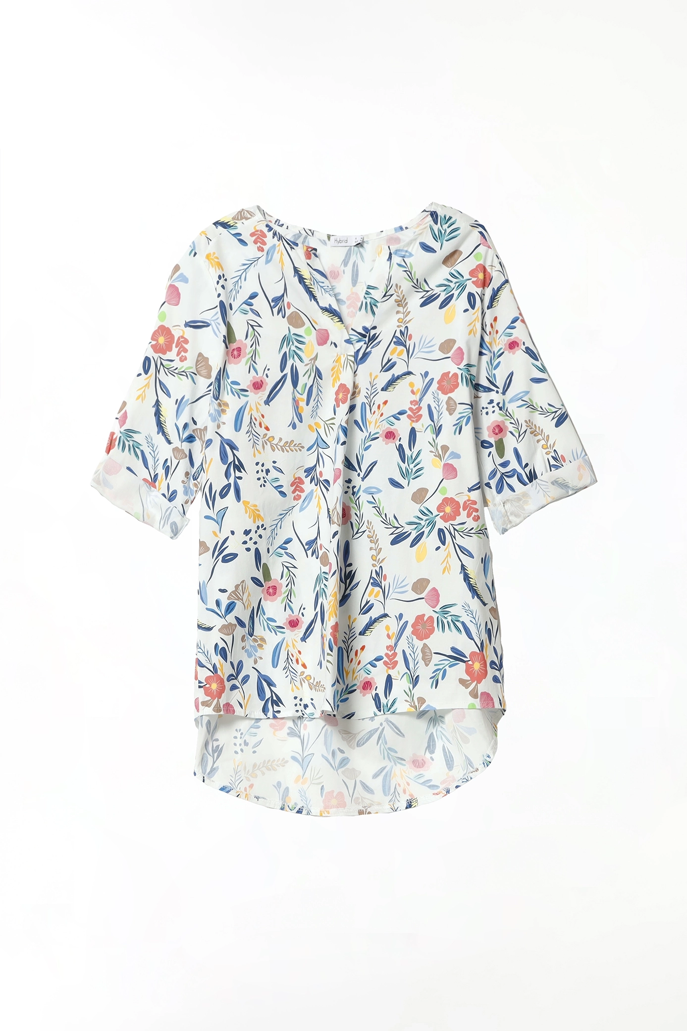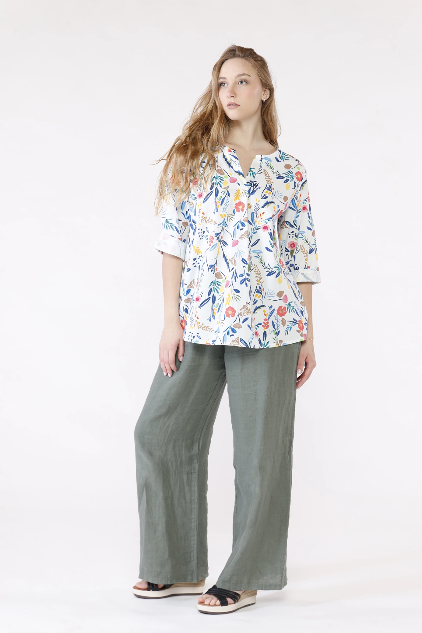 Blusa fantasia floreale, con manica a tre quarti e colletto alla coreana aperto sul davanti