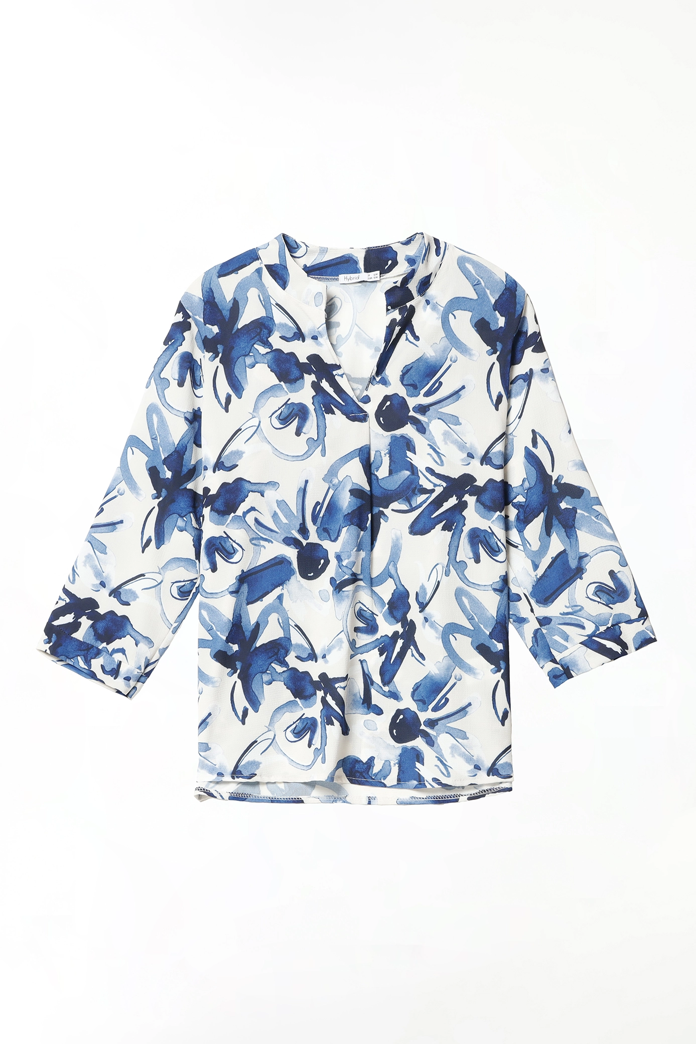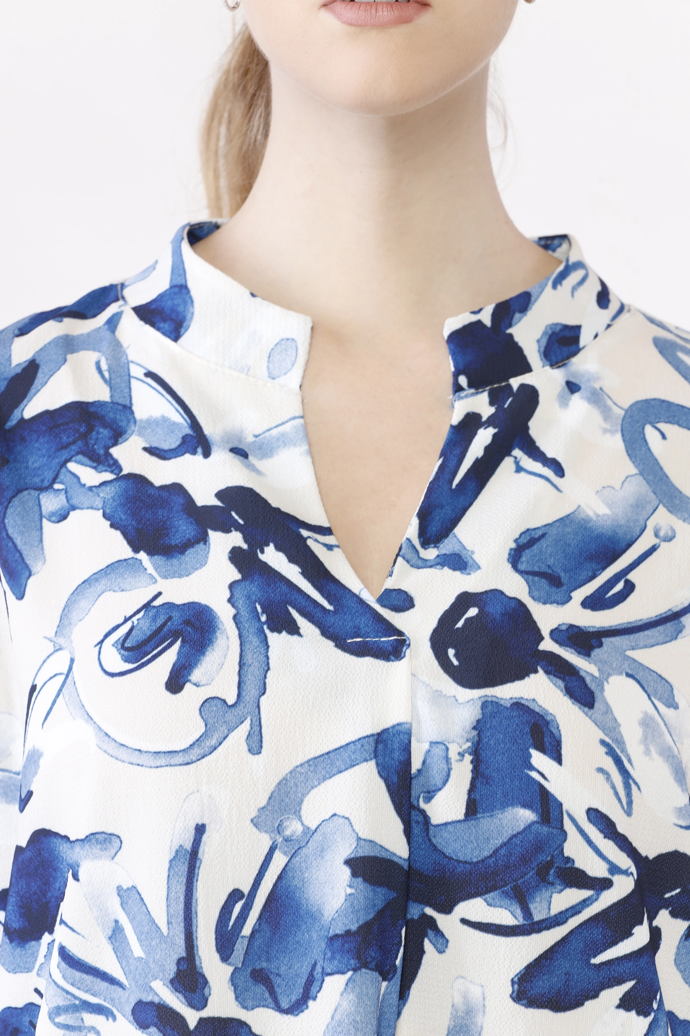 Blusa ampia a fantasia astratta, con maniche a Kimono e colletto alla coreana aperto a V