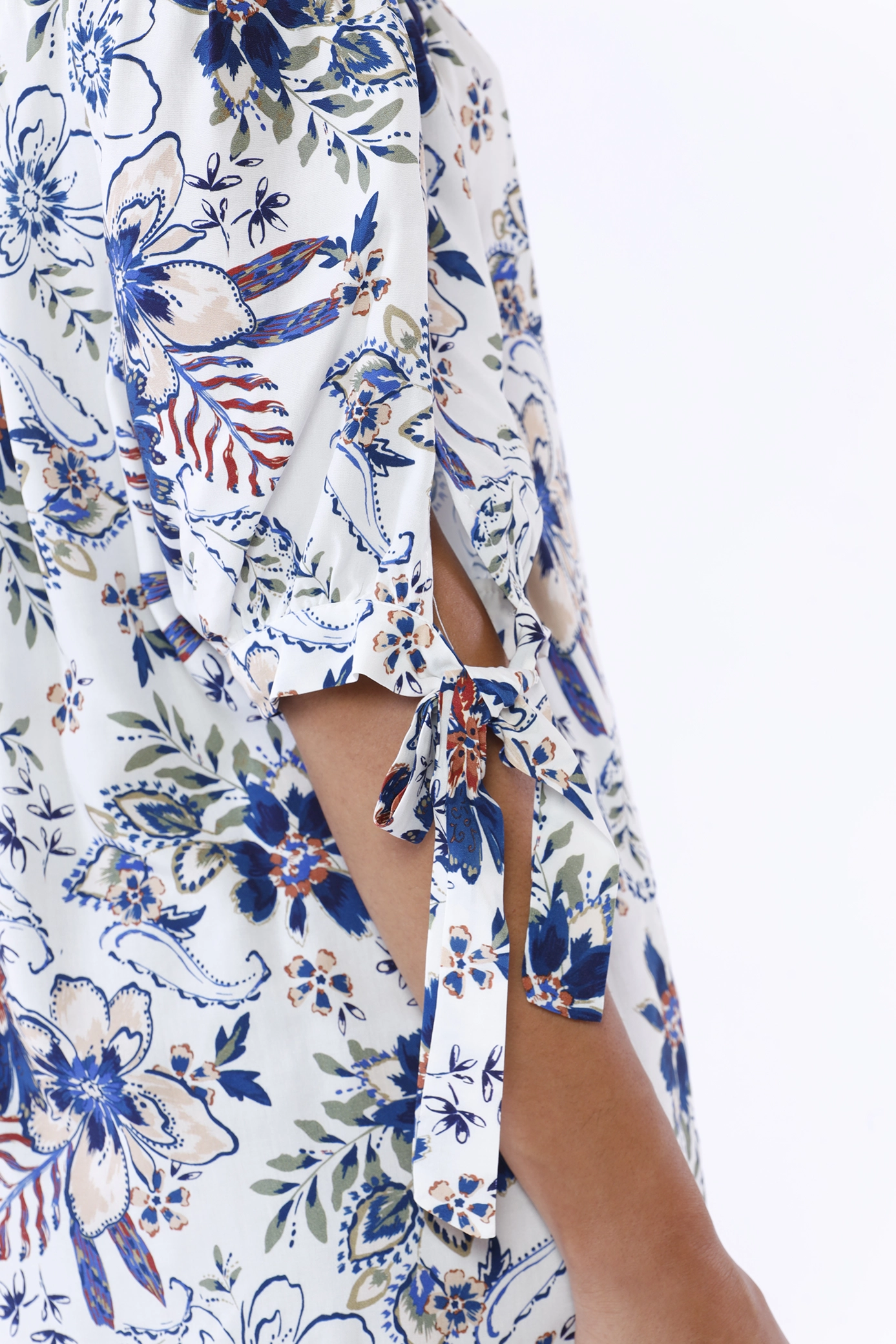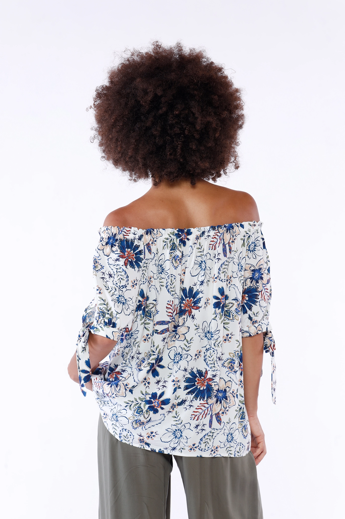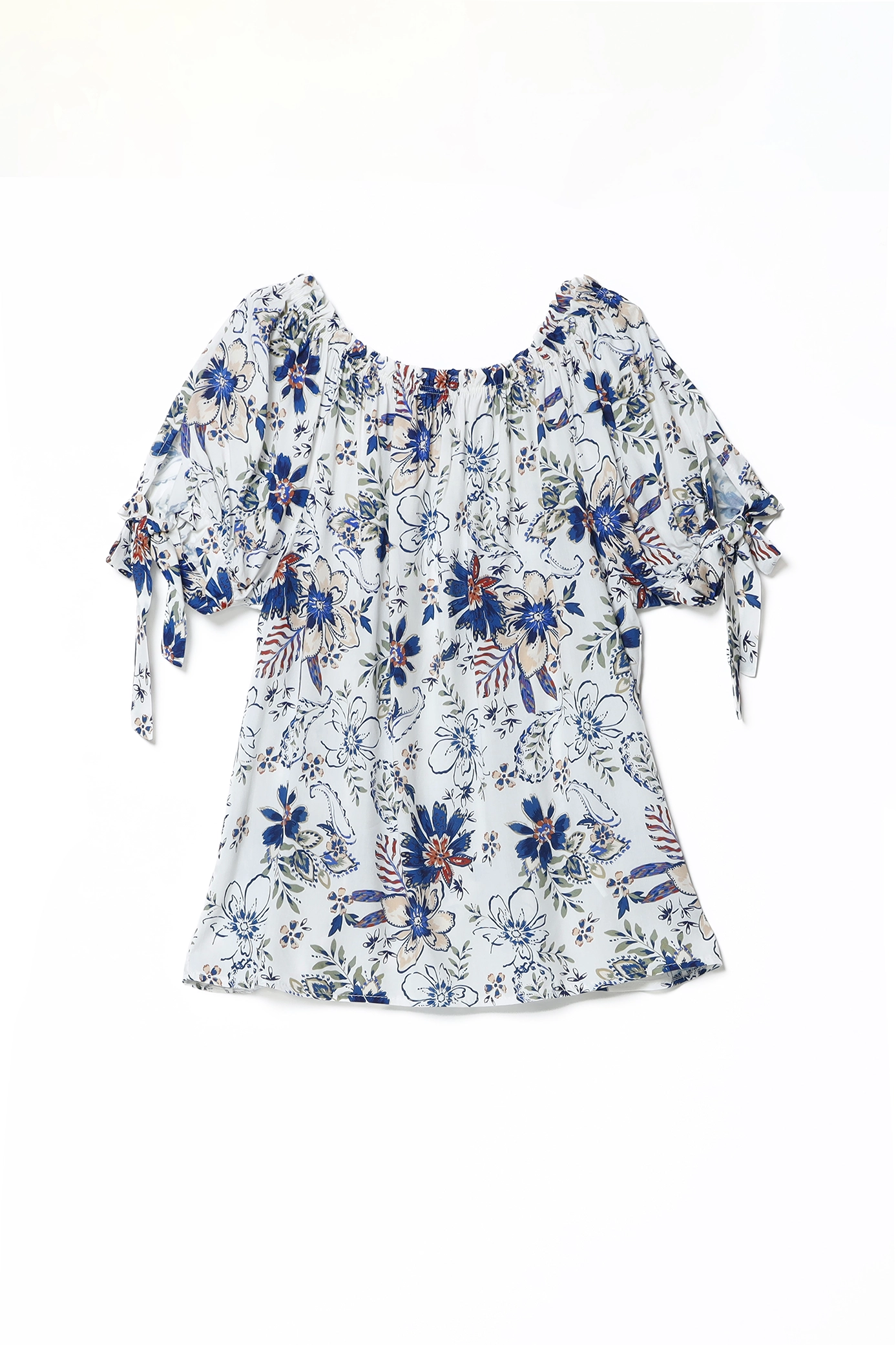 Blusa a fantasia di fiori, con elastico arricciato al collo e graziosi laccetti sulla manica corta