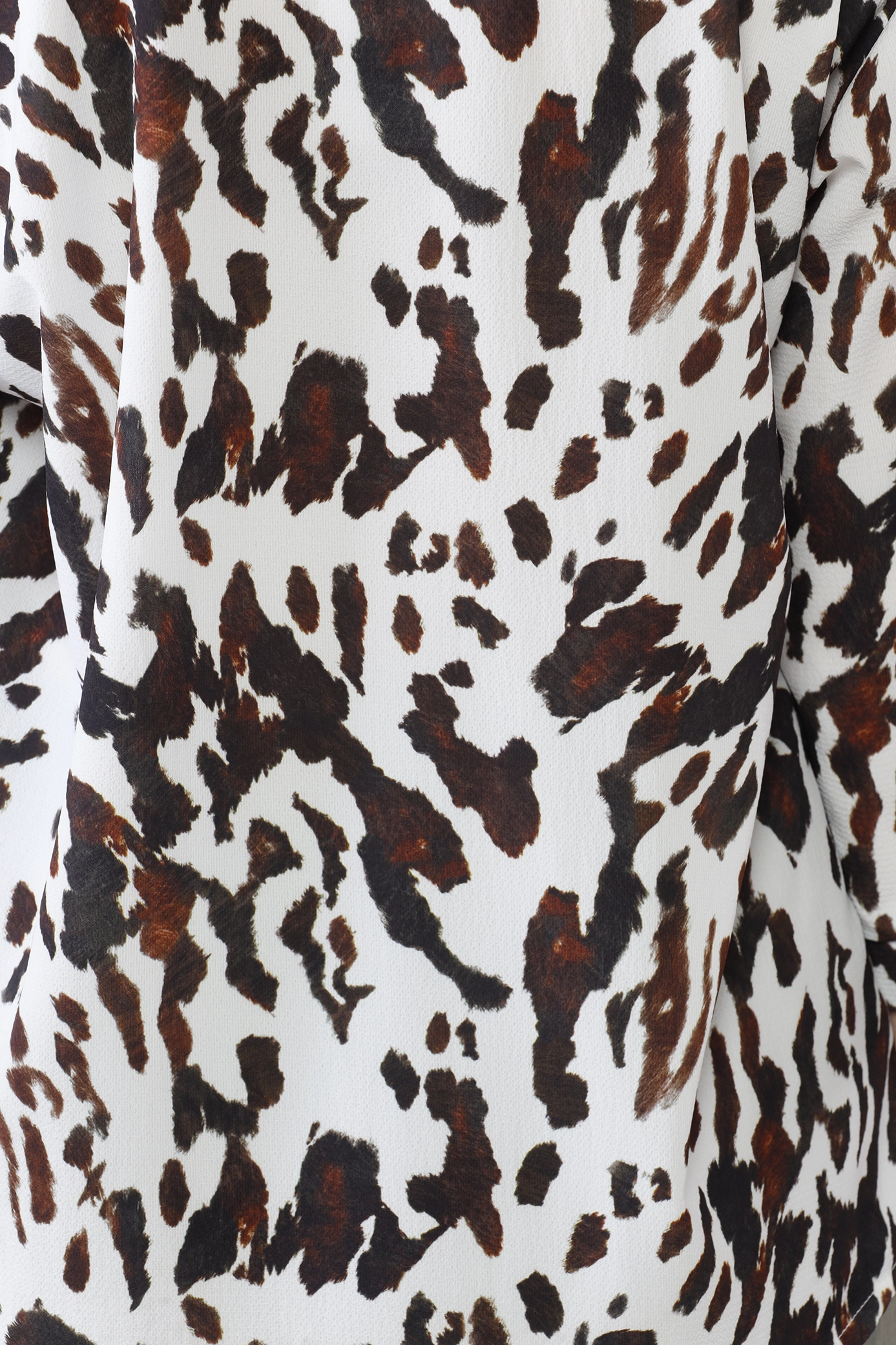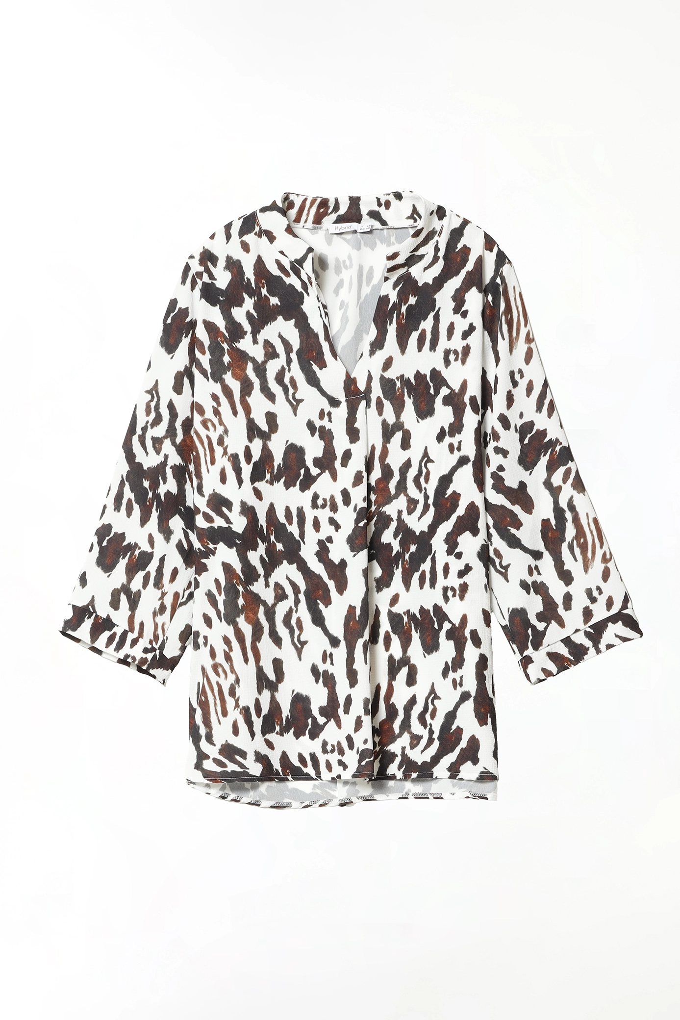 Blusa ampia a stampa maculata, con manica a kimono e colletto alla coreana aperto a V