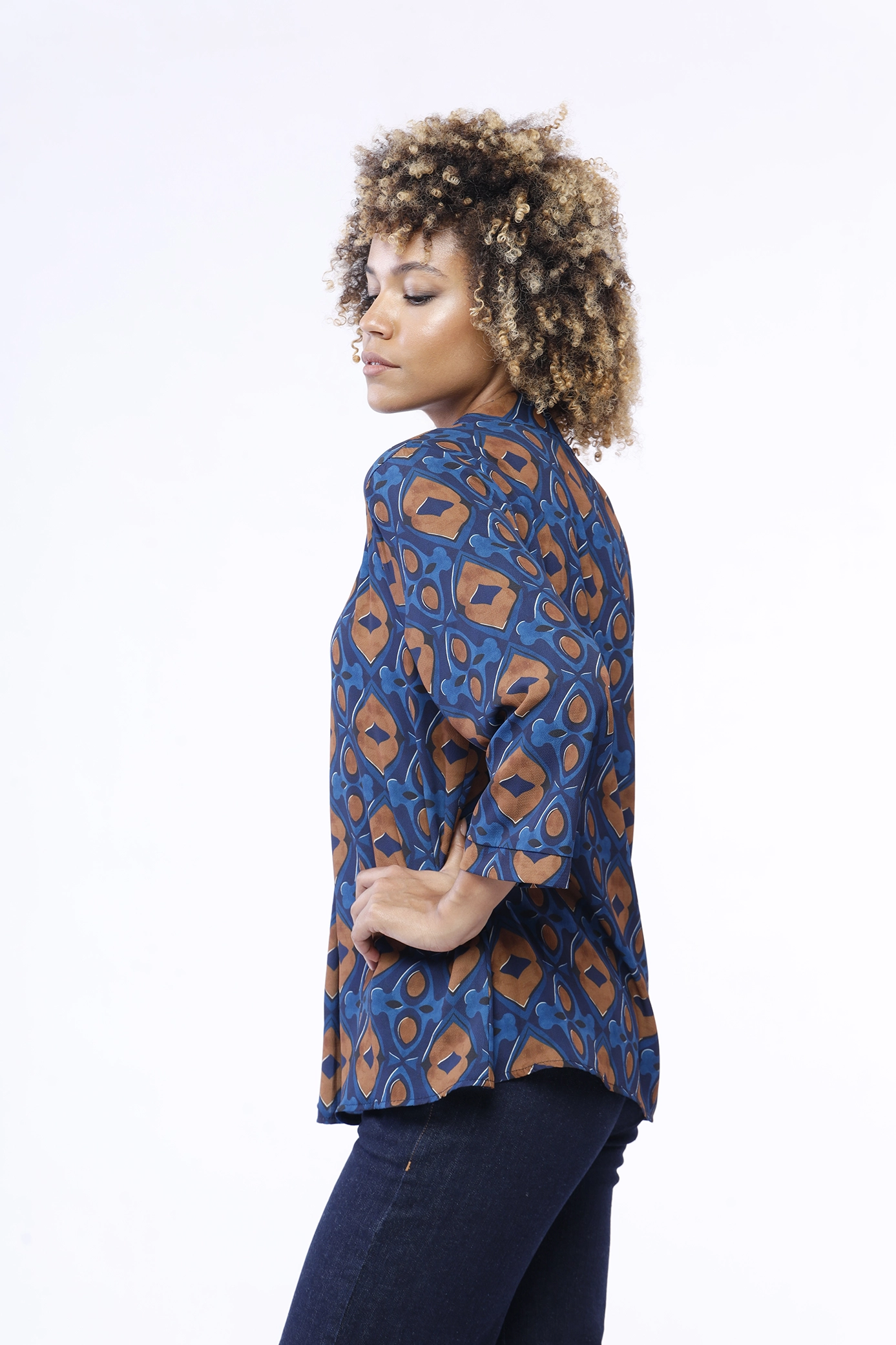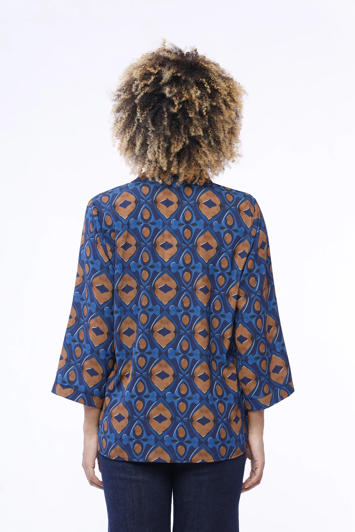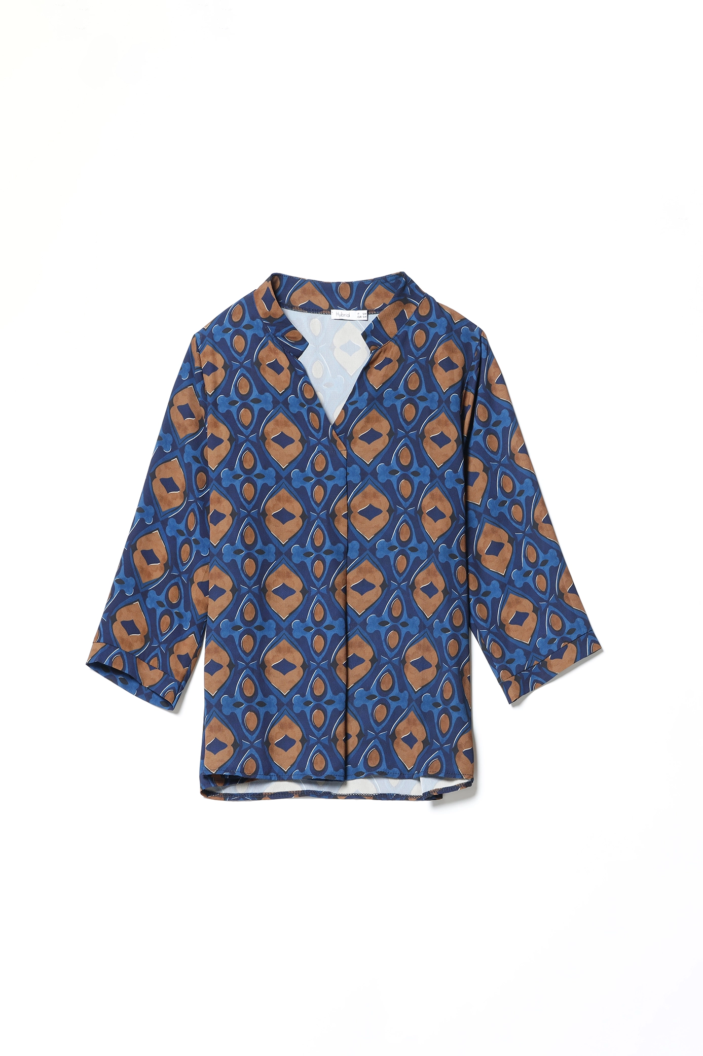 Blusa casual ampia a stampa fantasia, con colletto alla coreana aperto a V