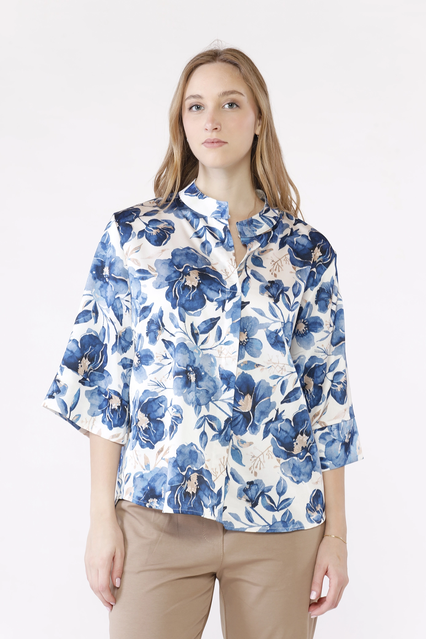 Blusa a fantasia di fiori con colletto alla coreana aperto a V e fondo arrotondato