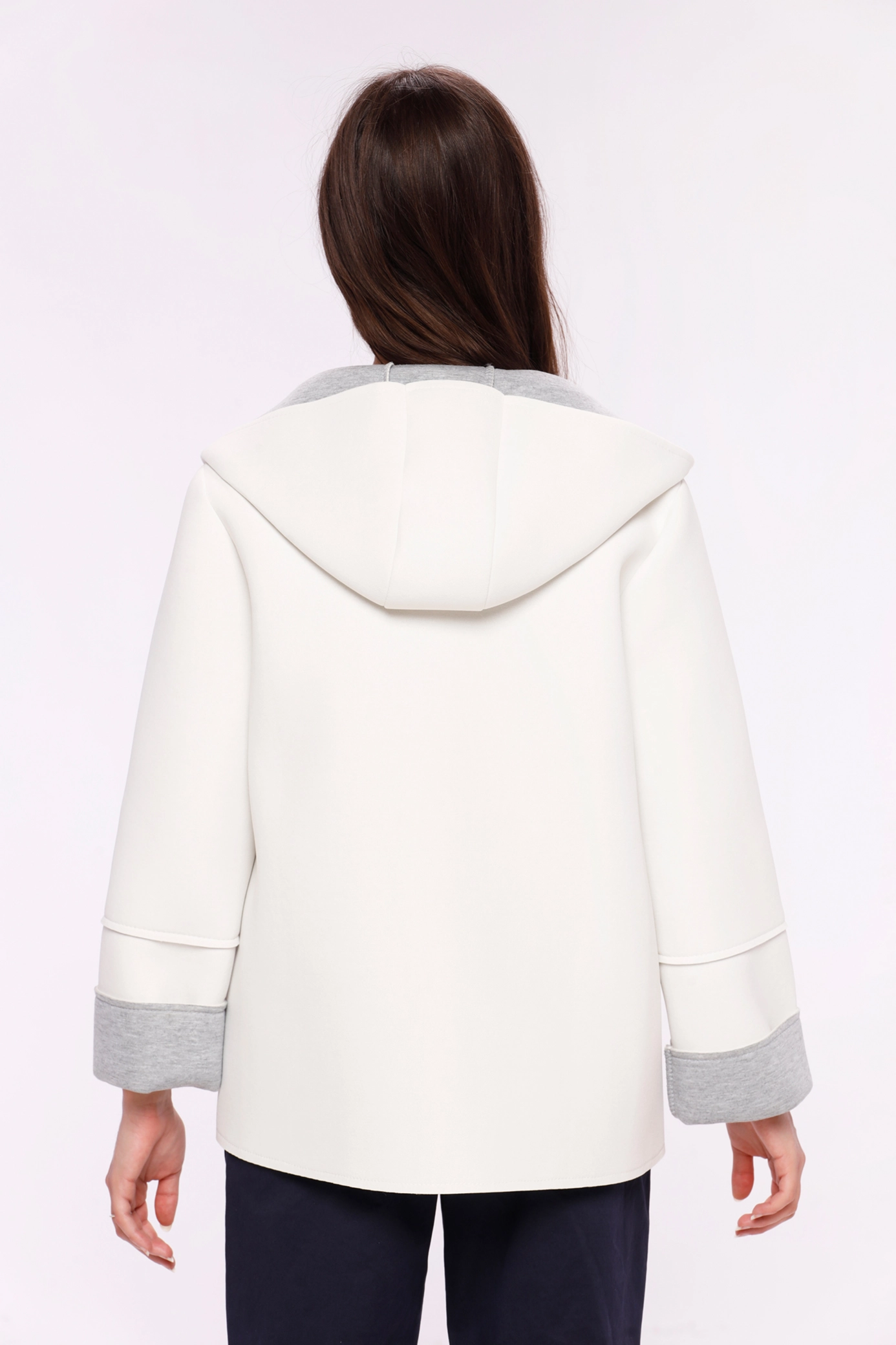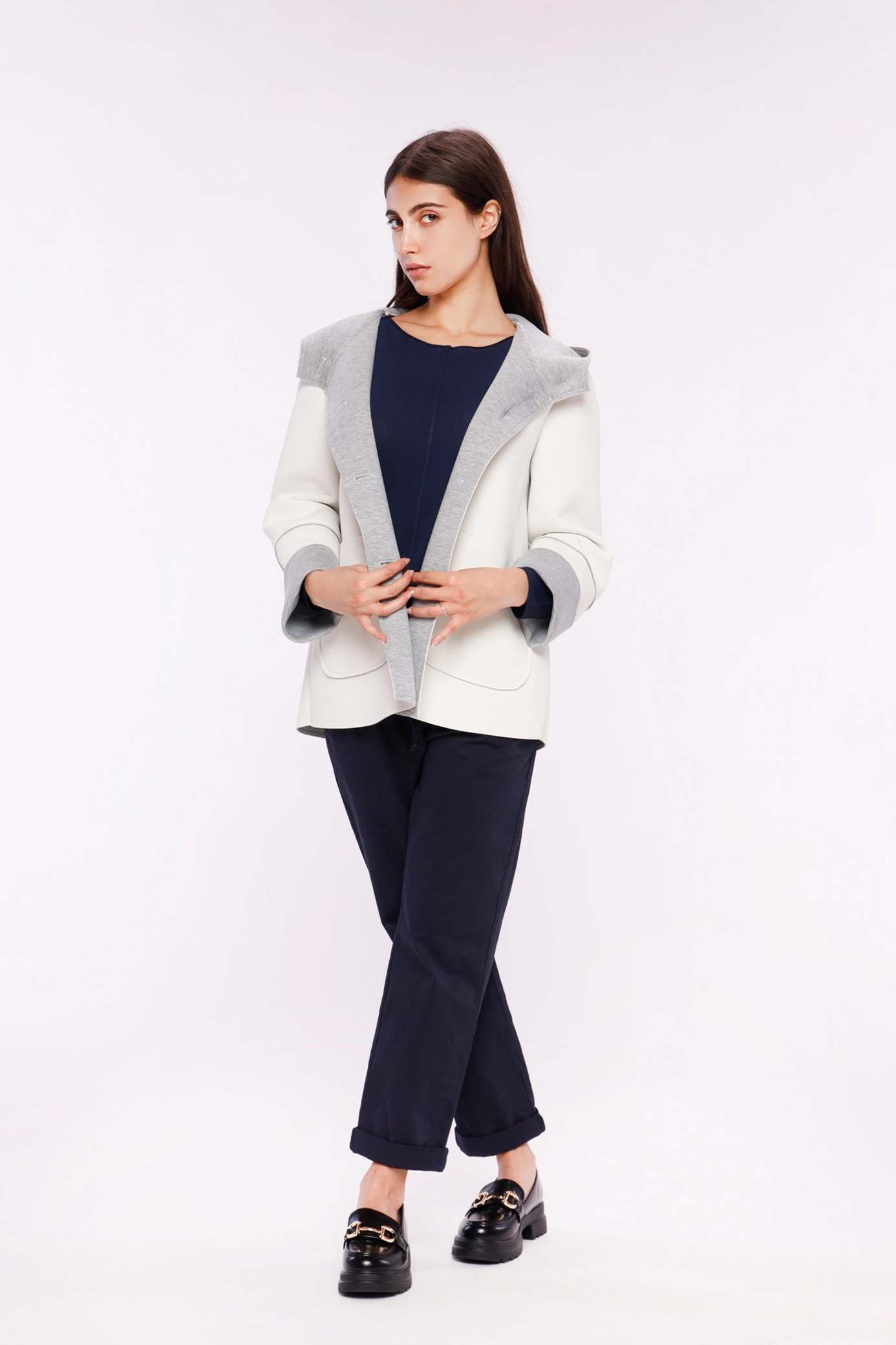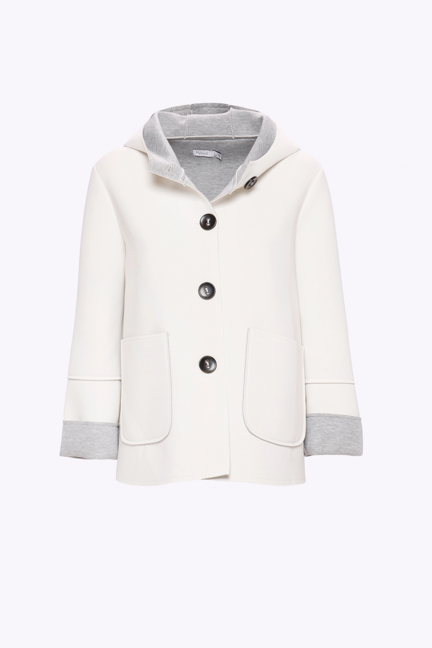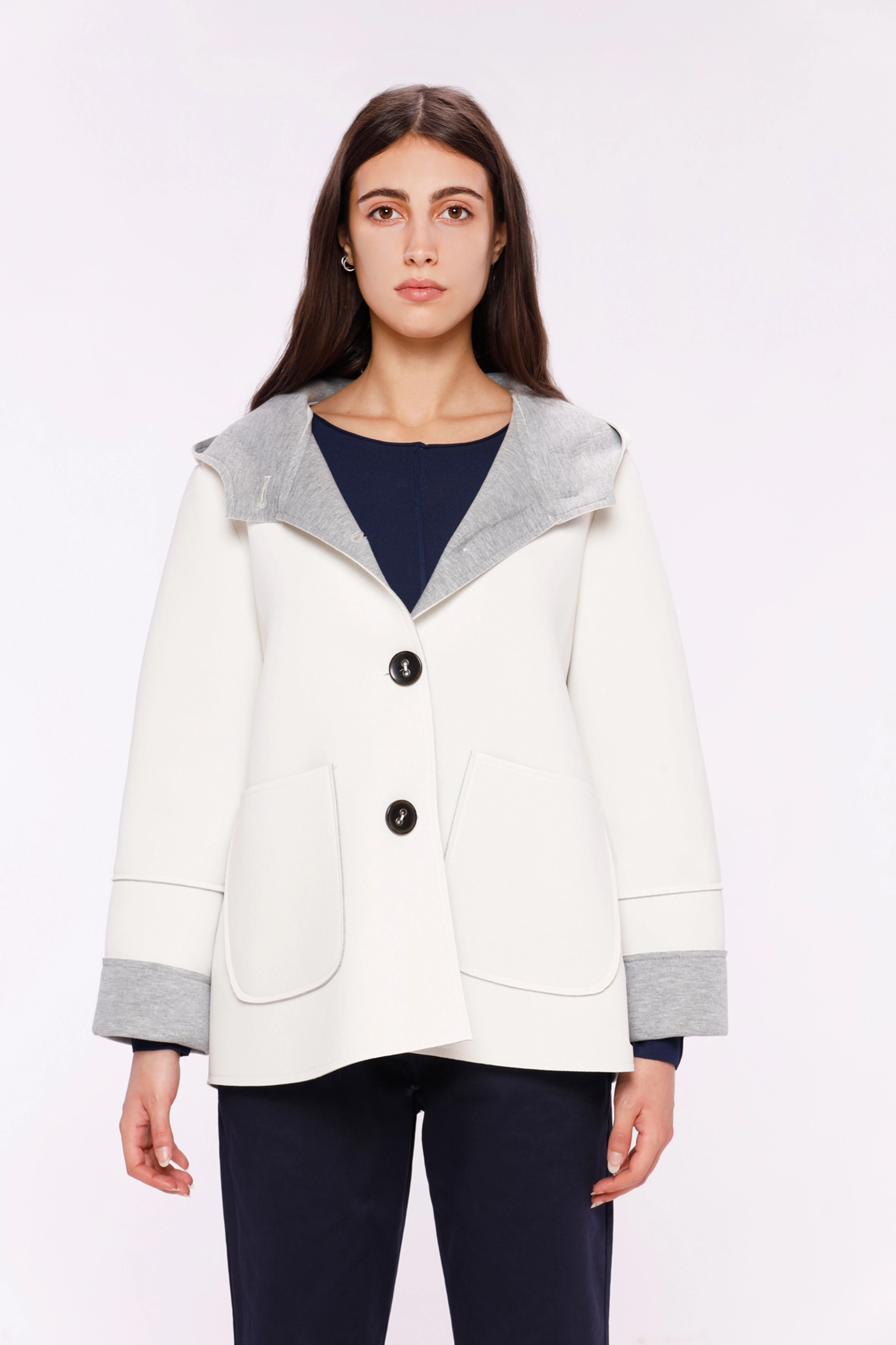 Cappotto primavera bicolore, con cappuccio, chiusura a bottoni e comode tasche laterali