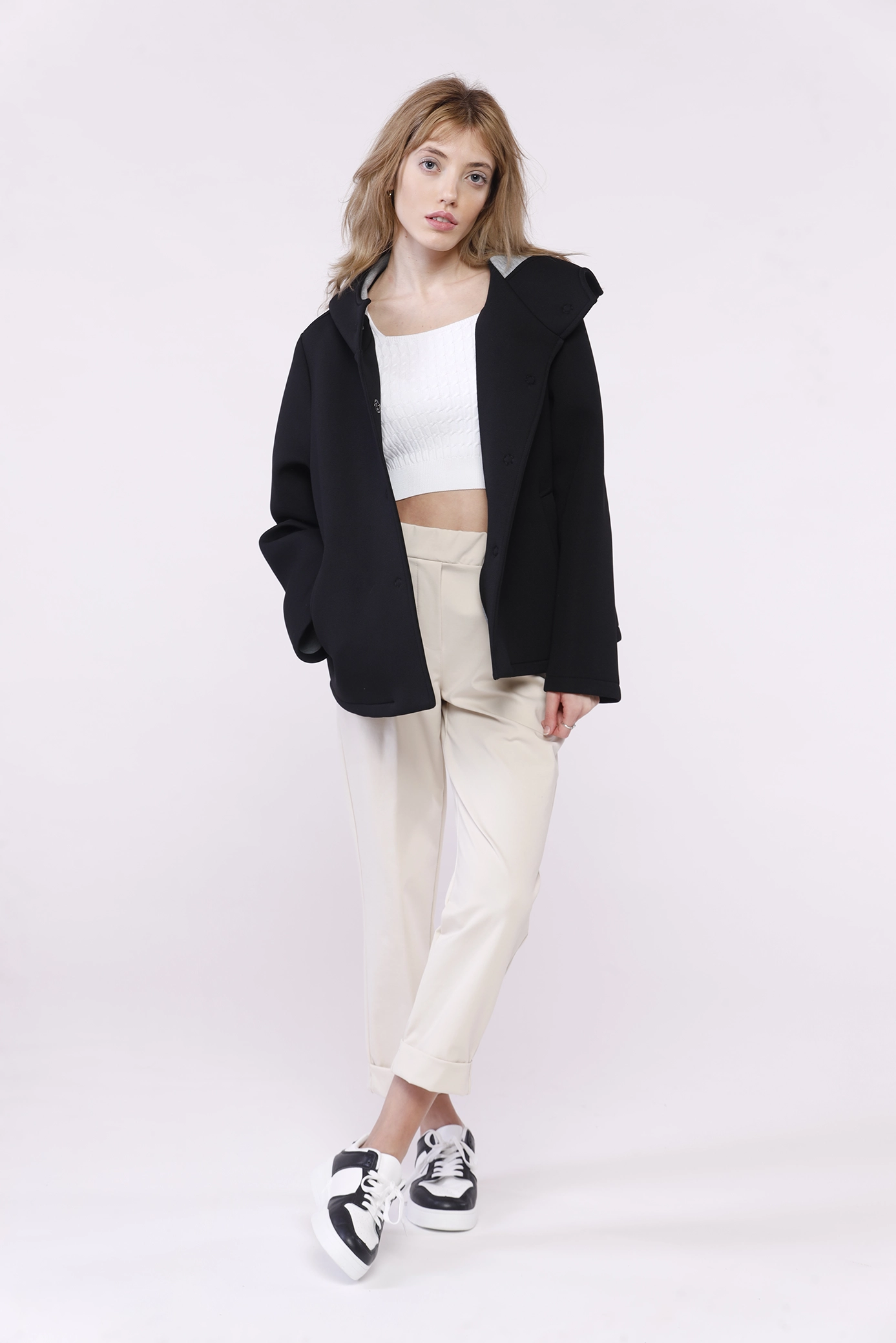 Cappotto corto softshell, con bottoncini nascosti, cappuccio e tasche diagonali