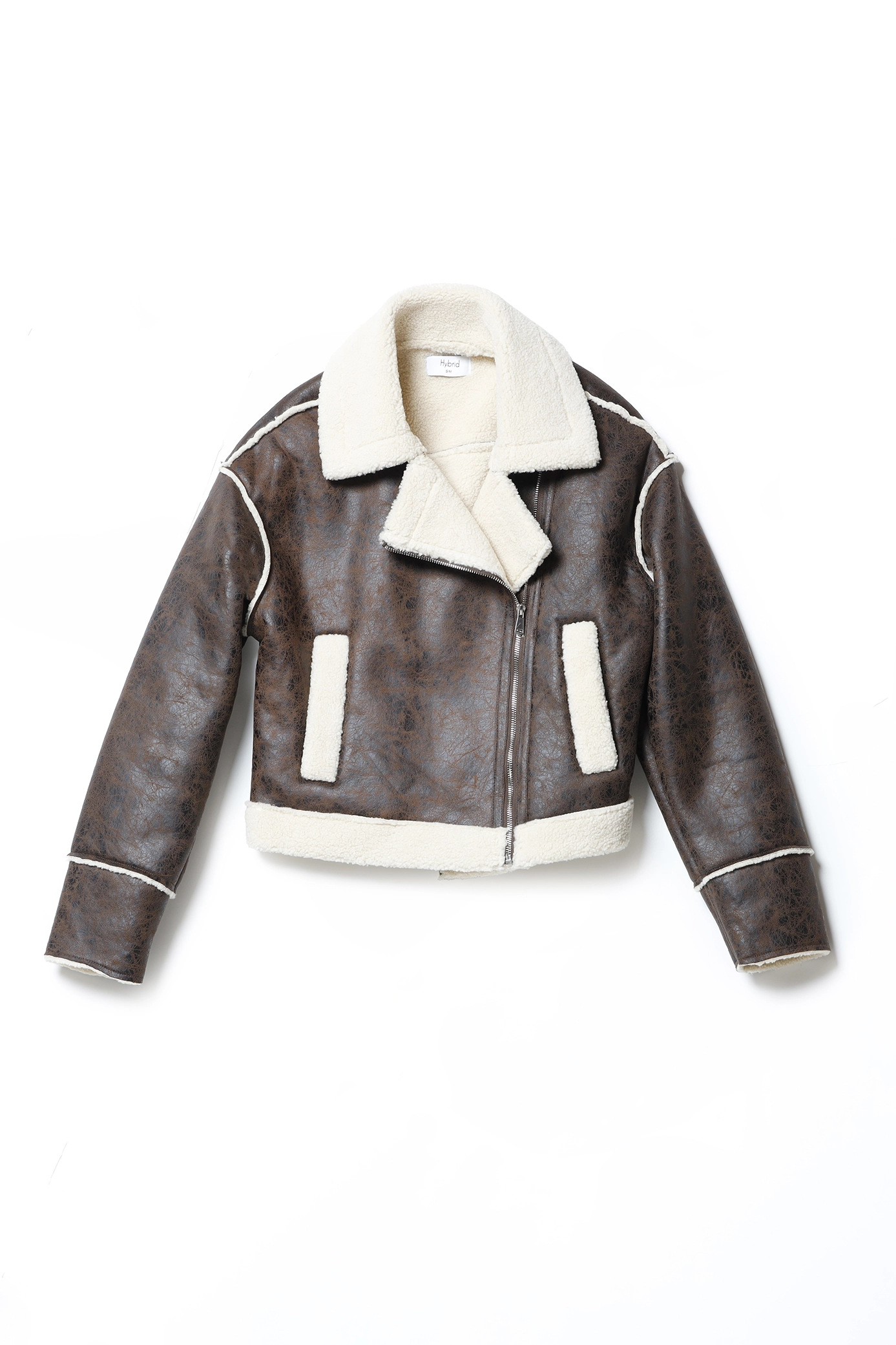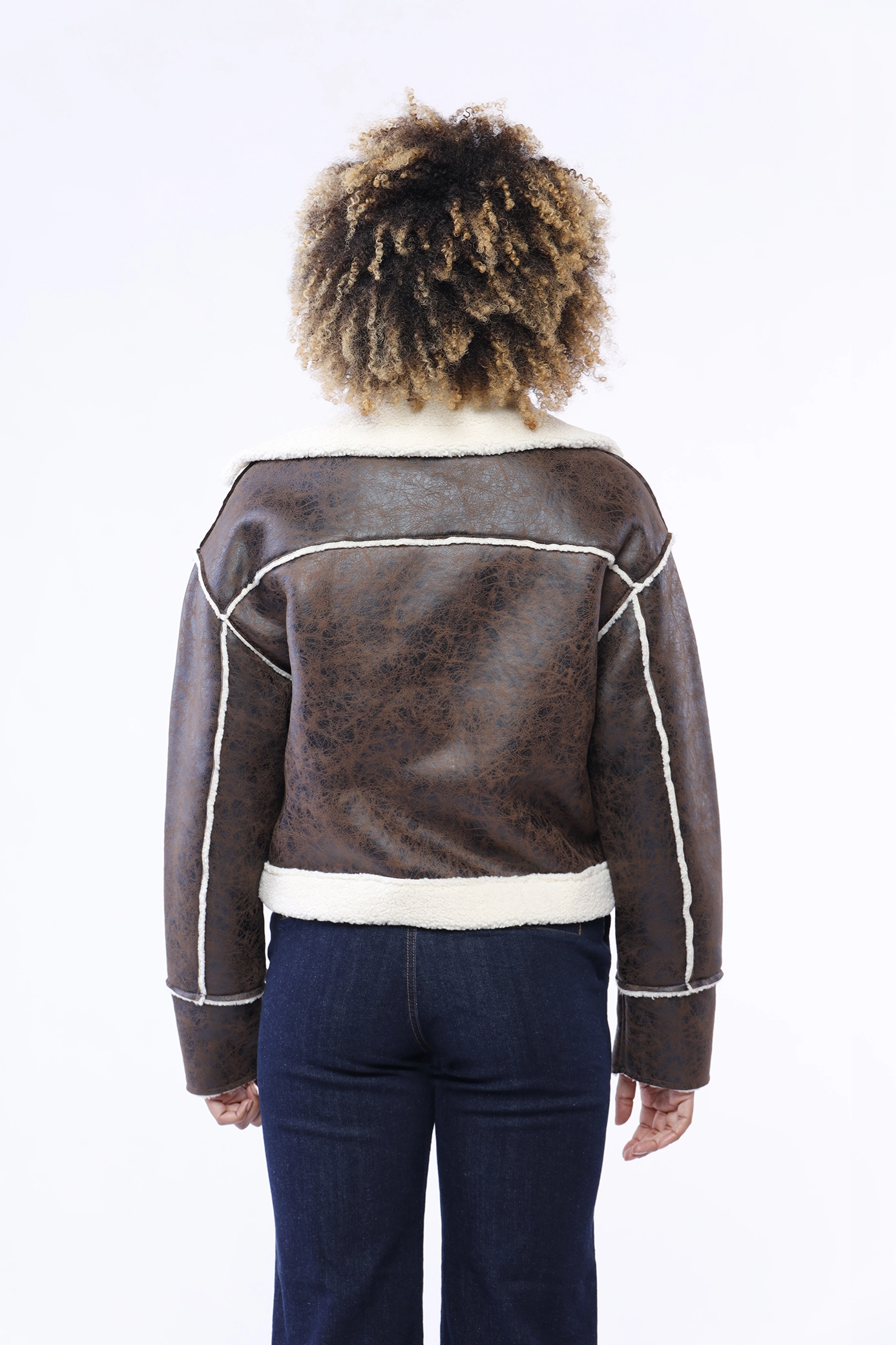 Giacca corta scamosciata con collo reverse, interno in teddy, tasche laterali e cerniera asimmetrica di tendenza