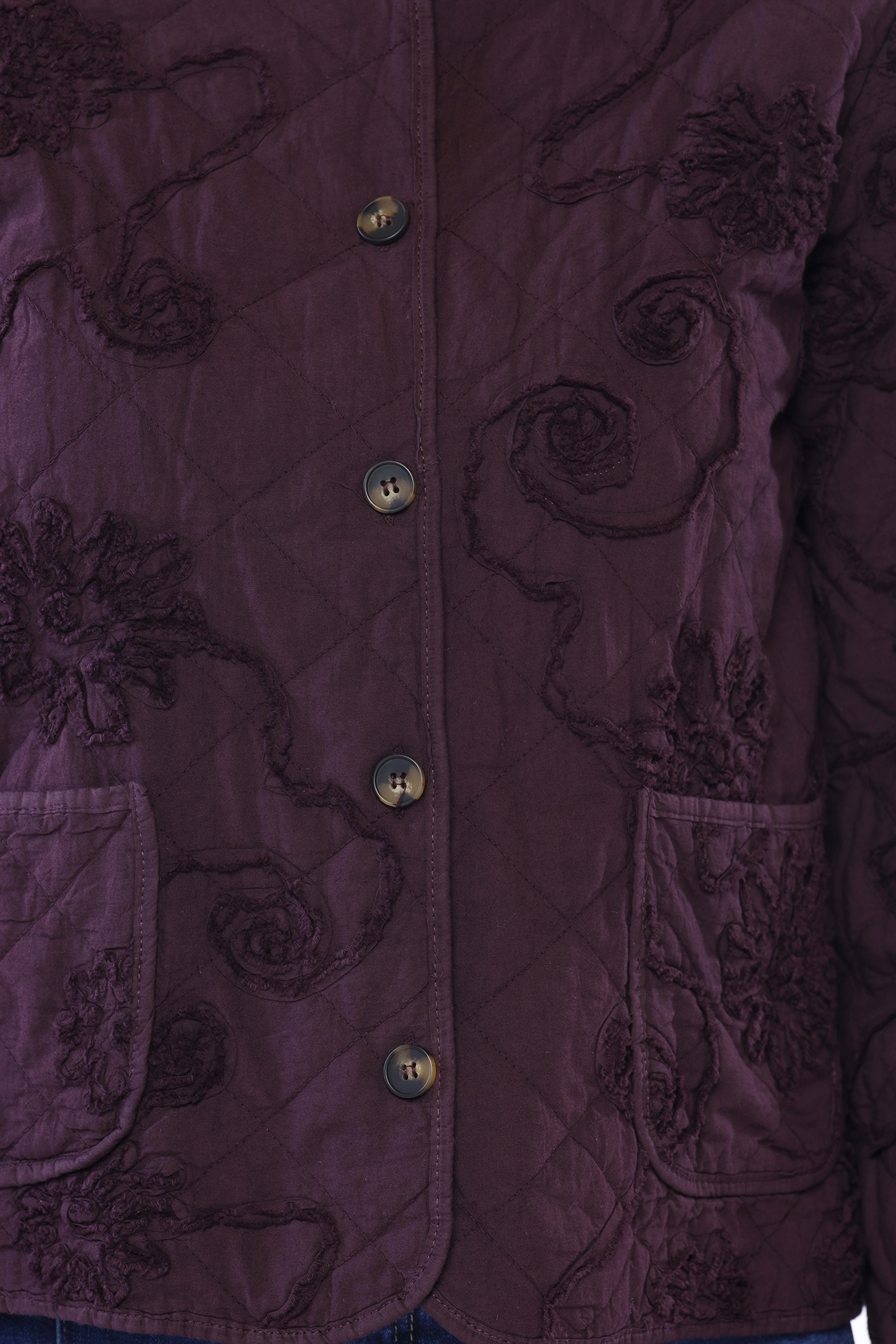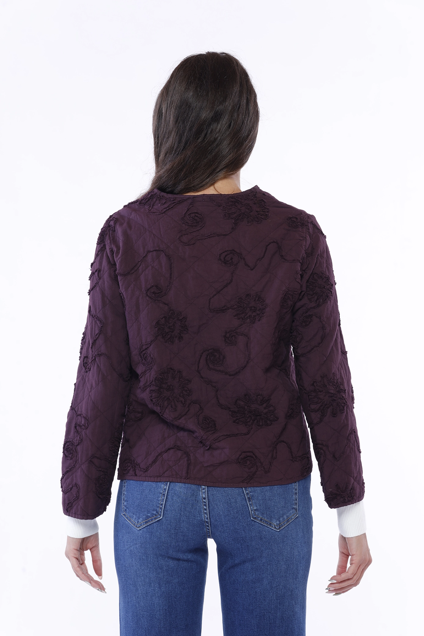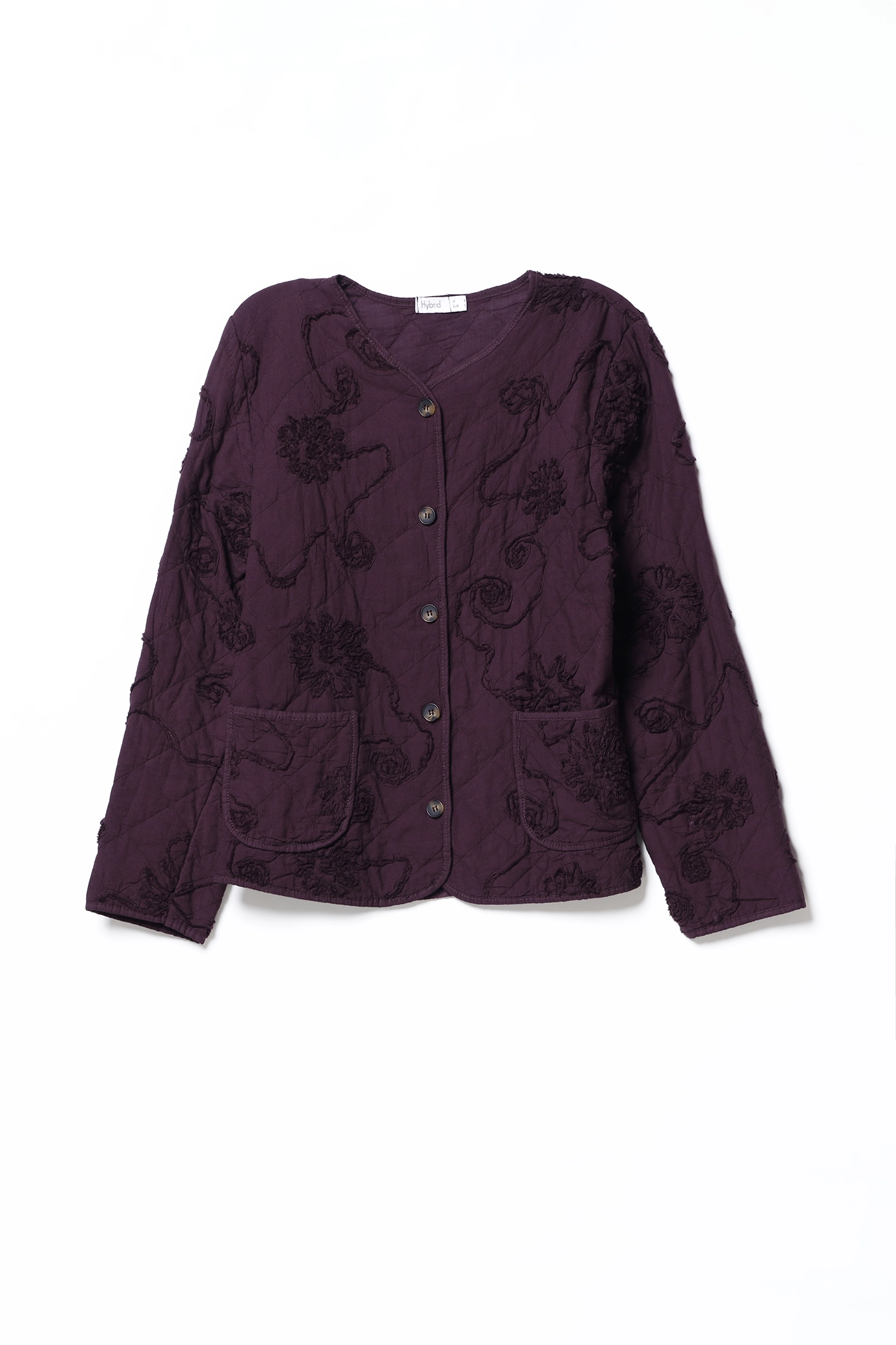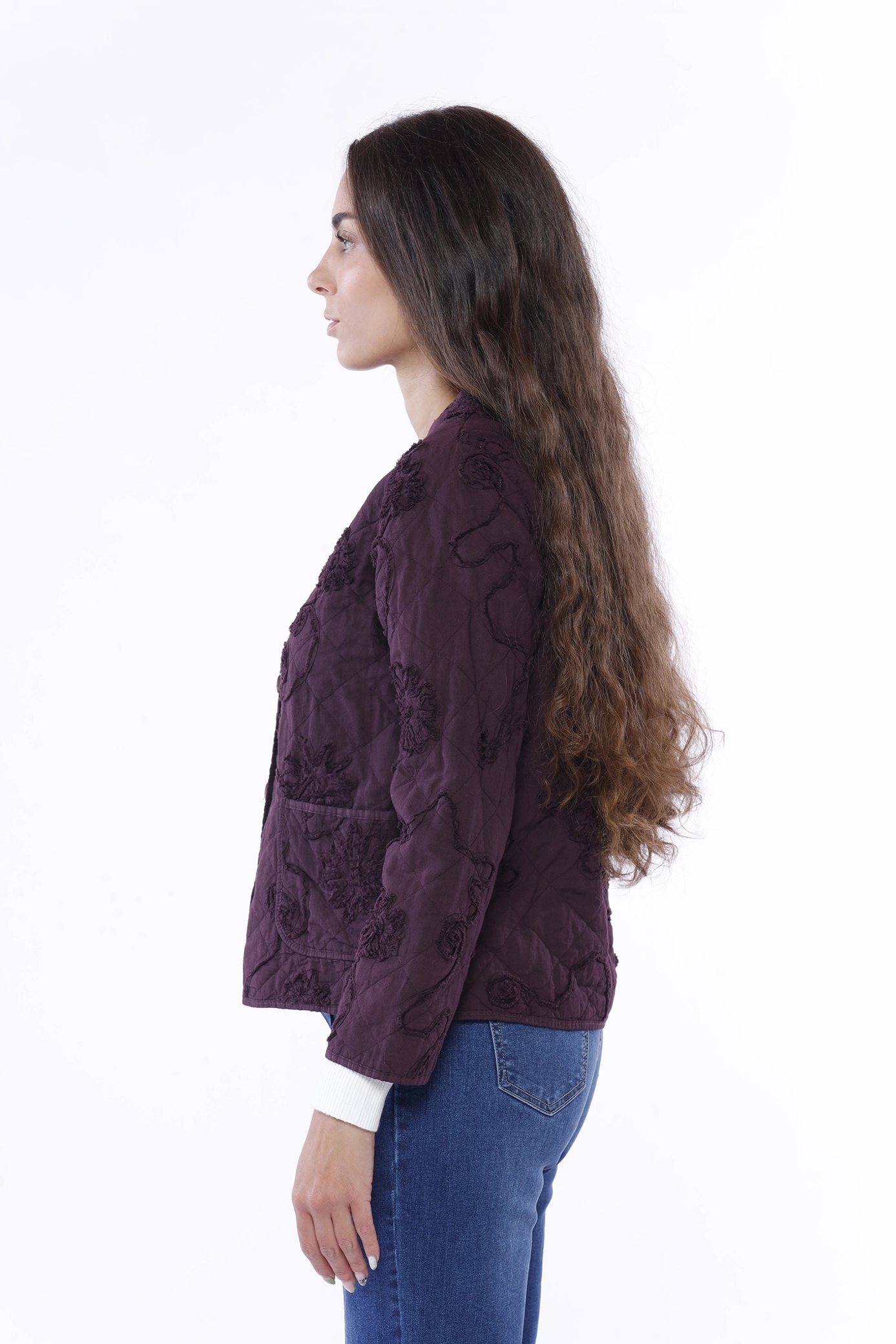 Giacca corta ricamata, senza colletto, chiusura a bottoni e orli arrotondati. Graziose taschine applicate sul davanti