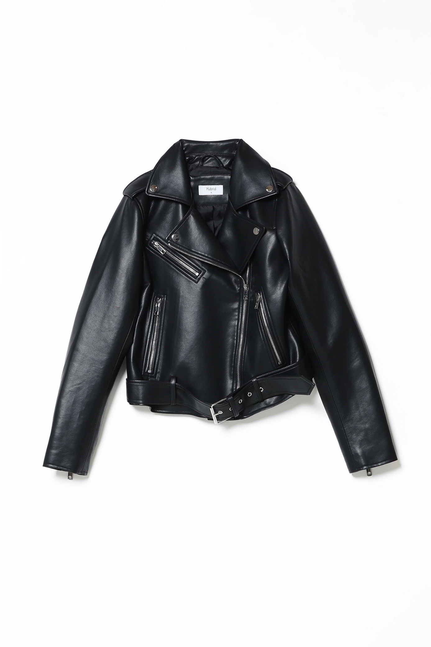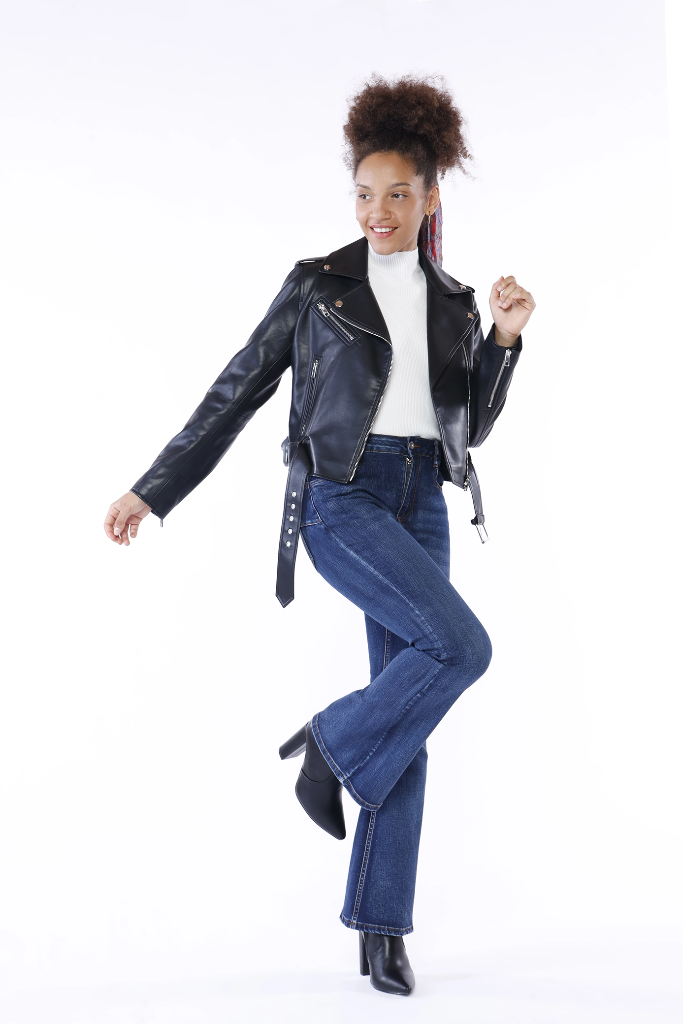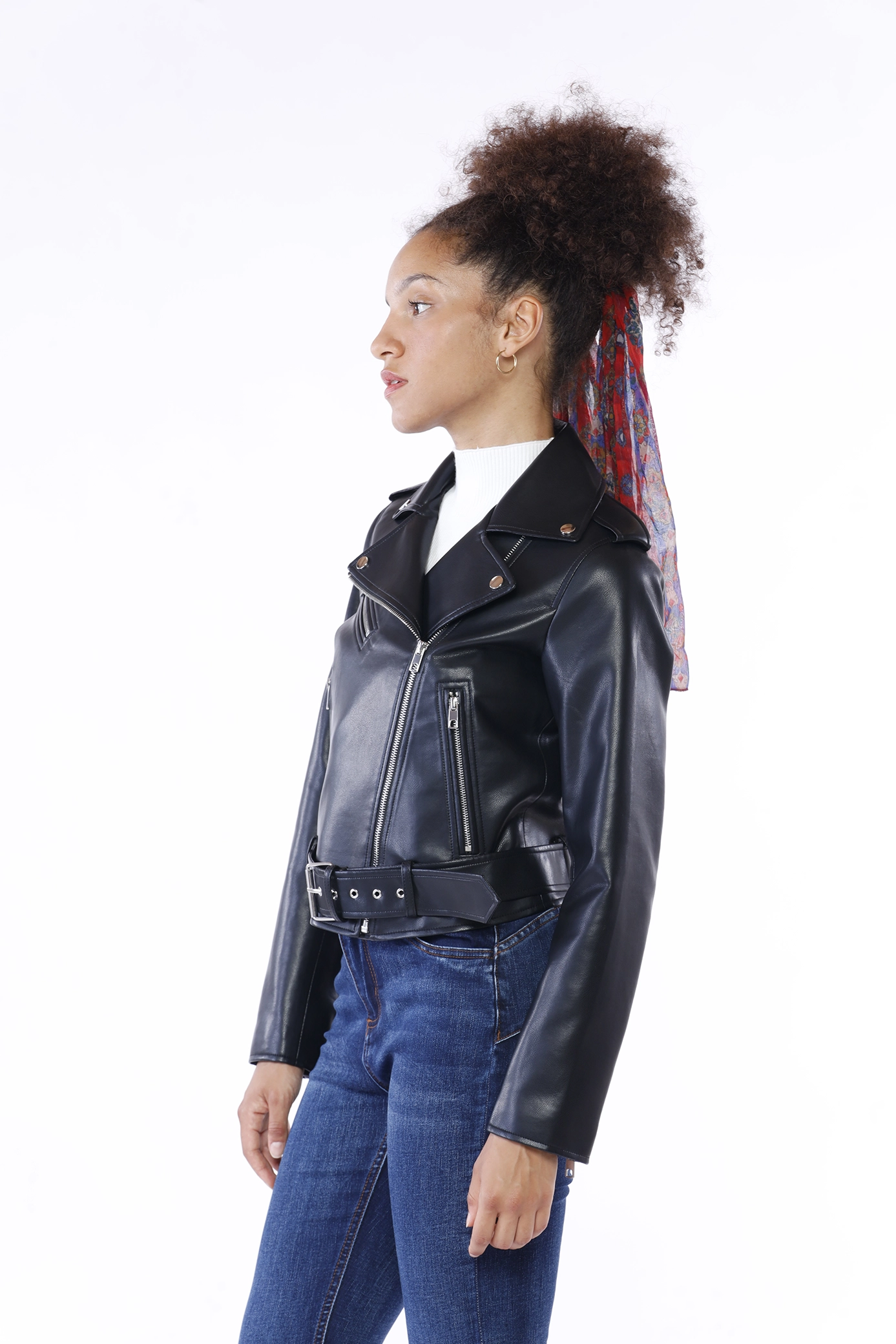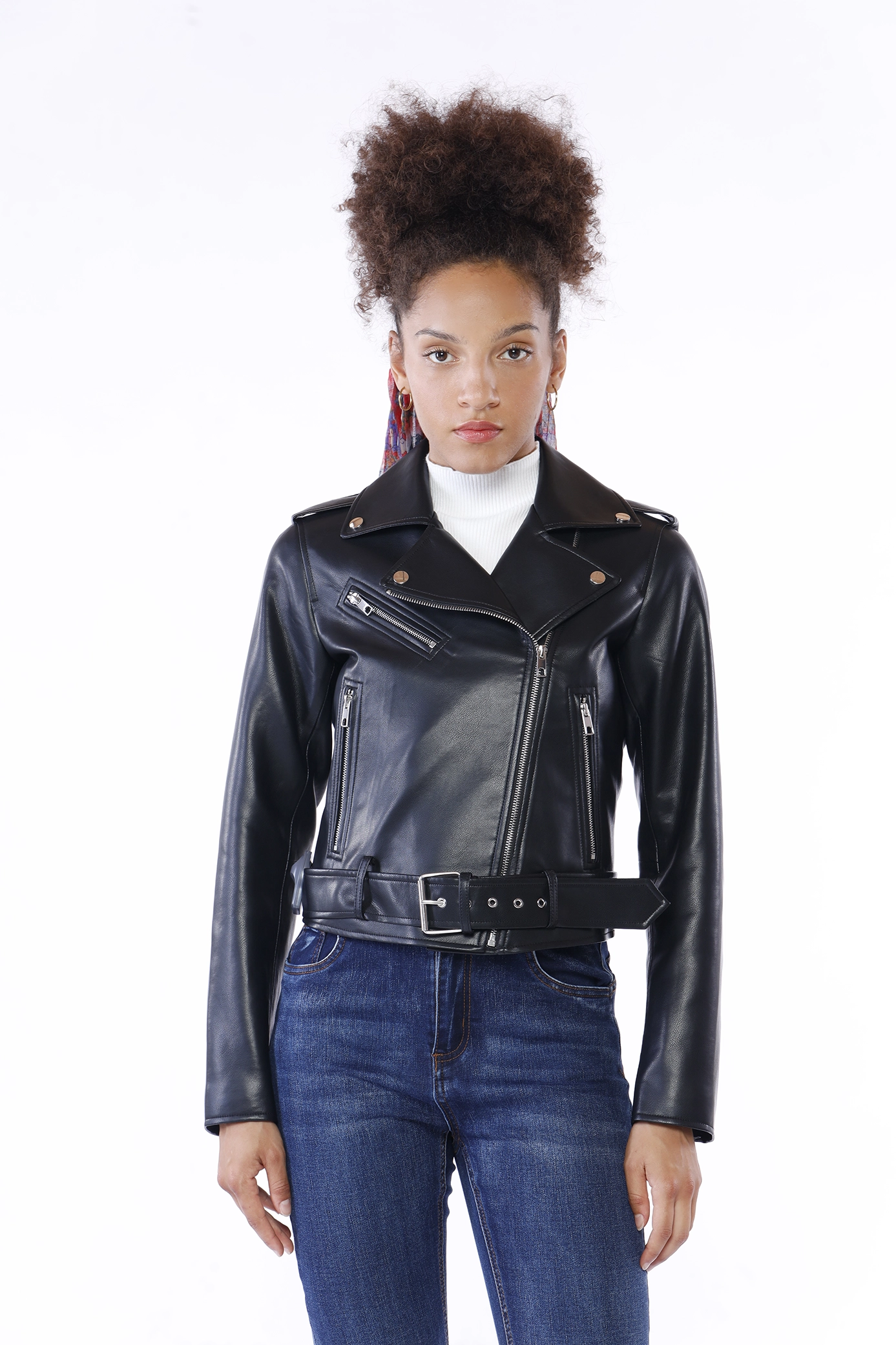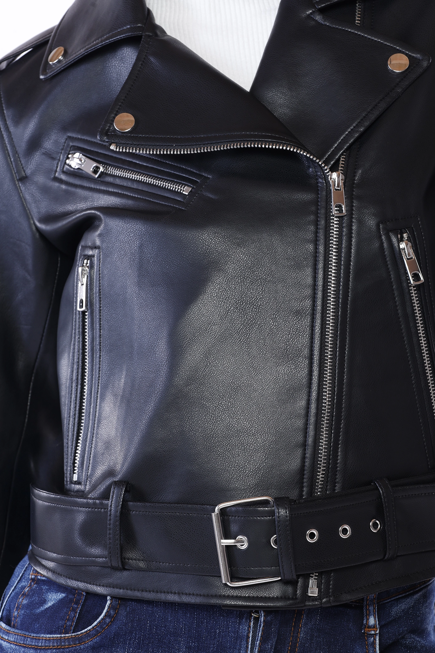 Giacca corta in ecopelle di tendenza con collo reverse, chiusa da cerniera asimmetrica e con cinta al fondo
