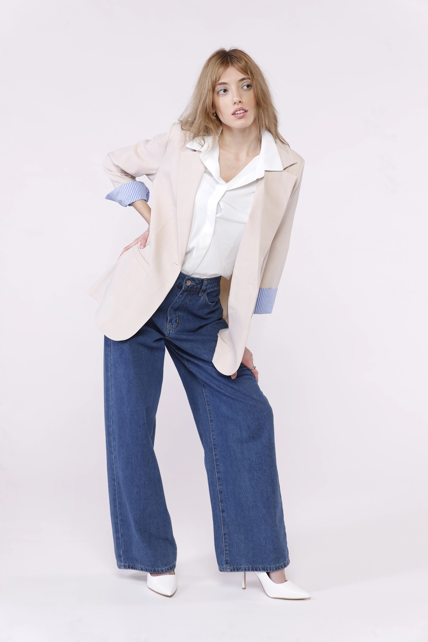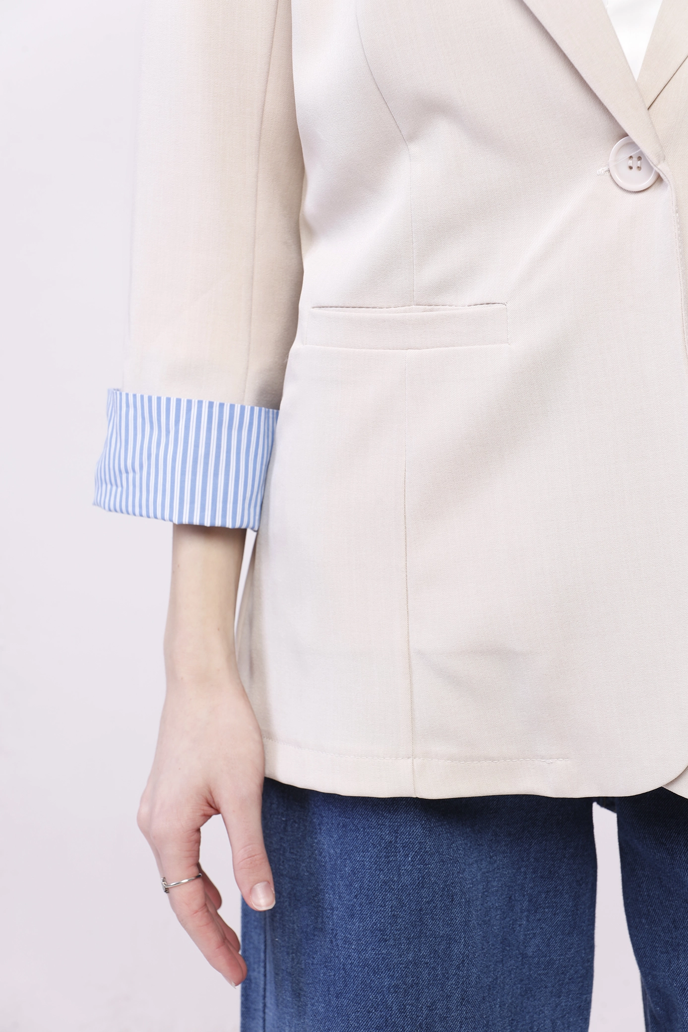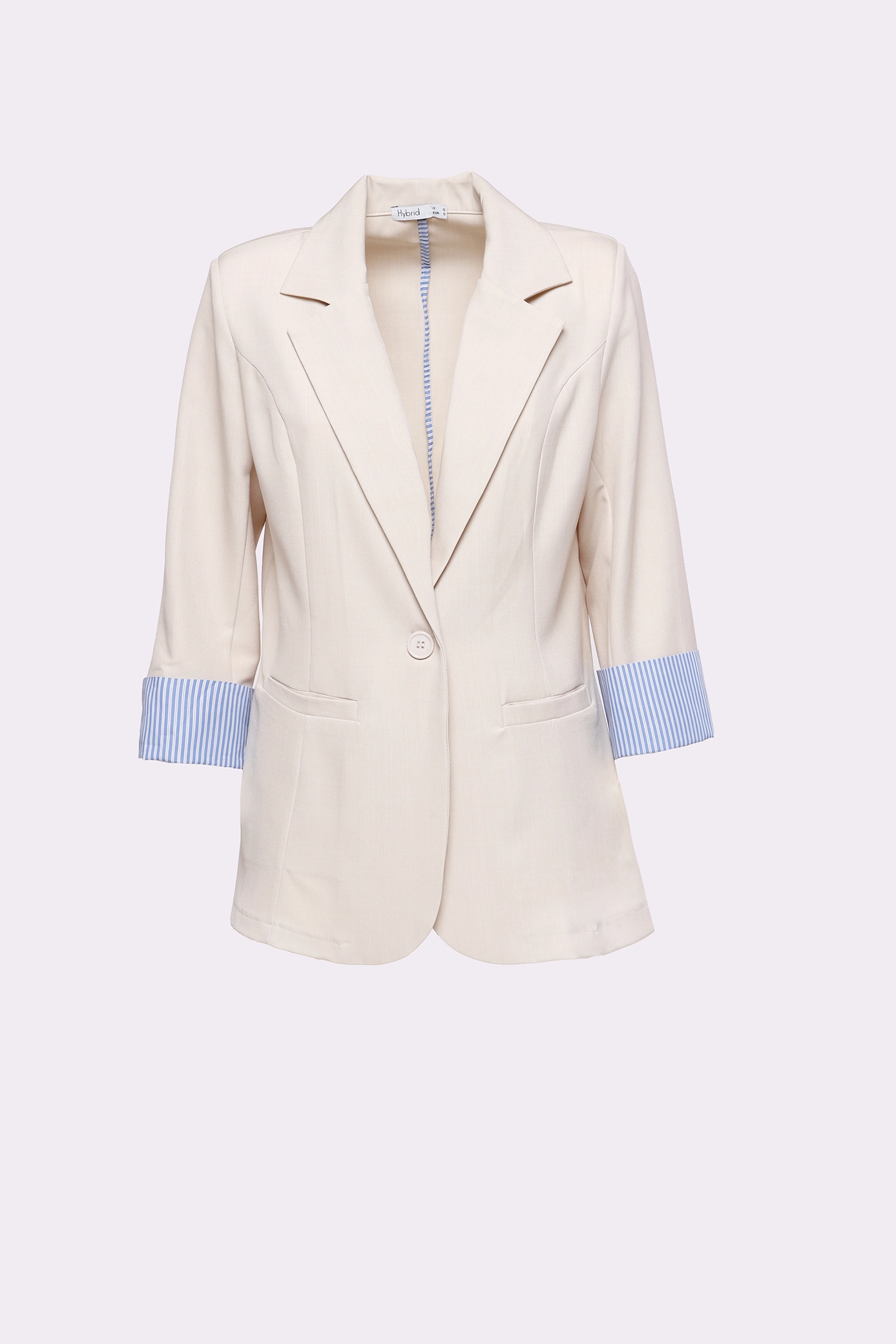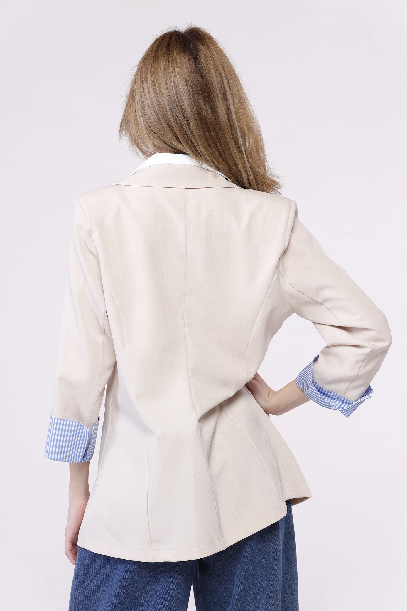 Giacca business woman, monopetto sagomata, con collo reverse e manica a tre quarti risvoltata a contrasto