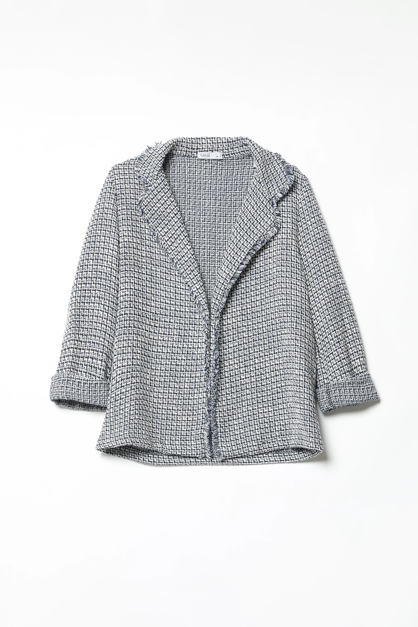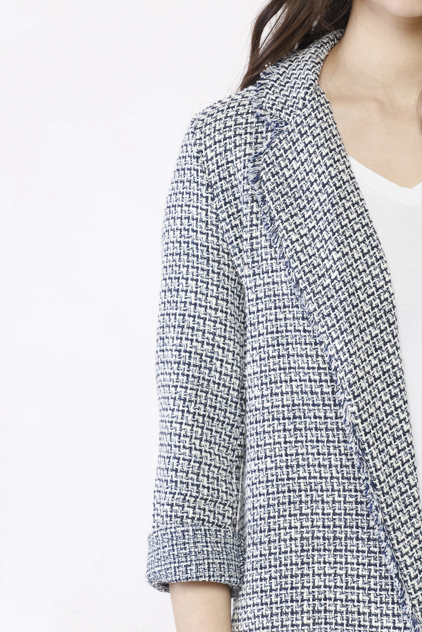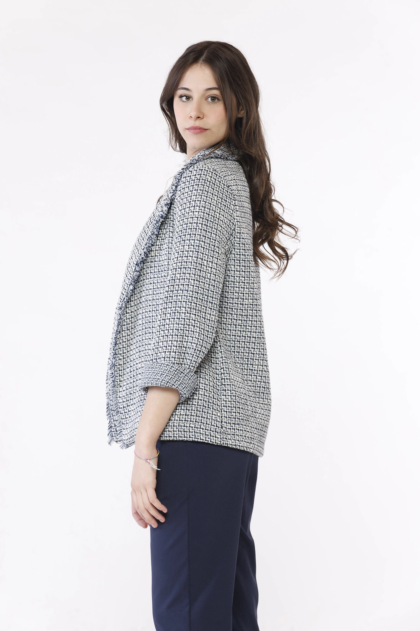 Giacca chanel con collo reverse e orlo sfrangiato, a manica risvoltata
