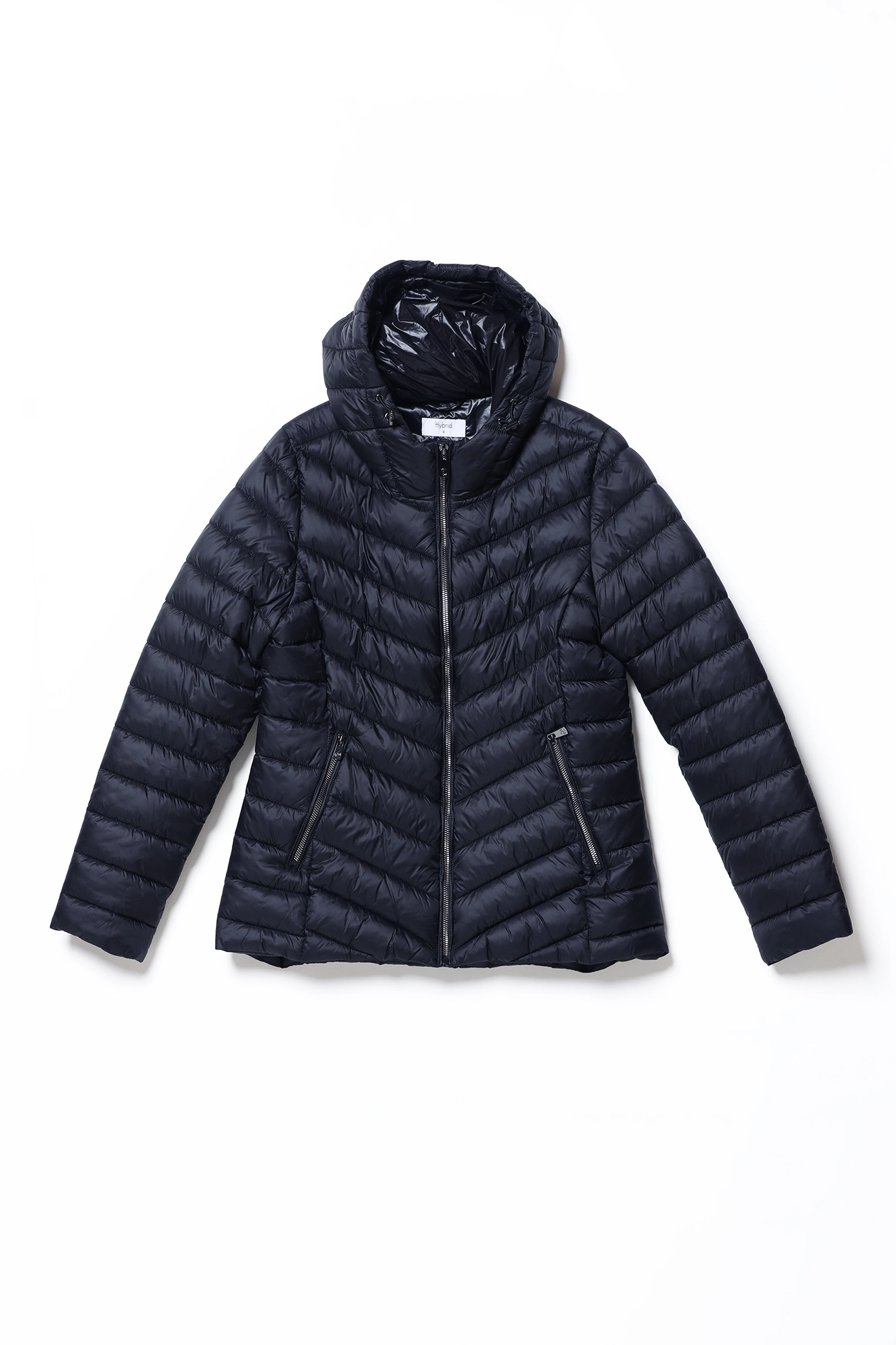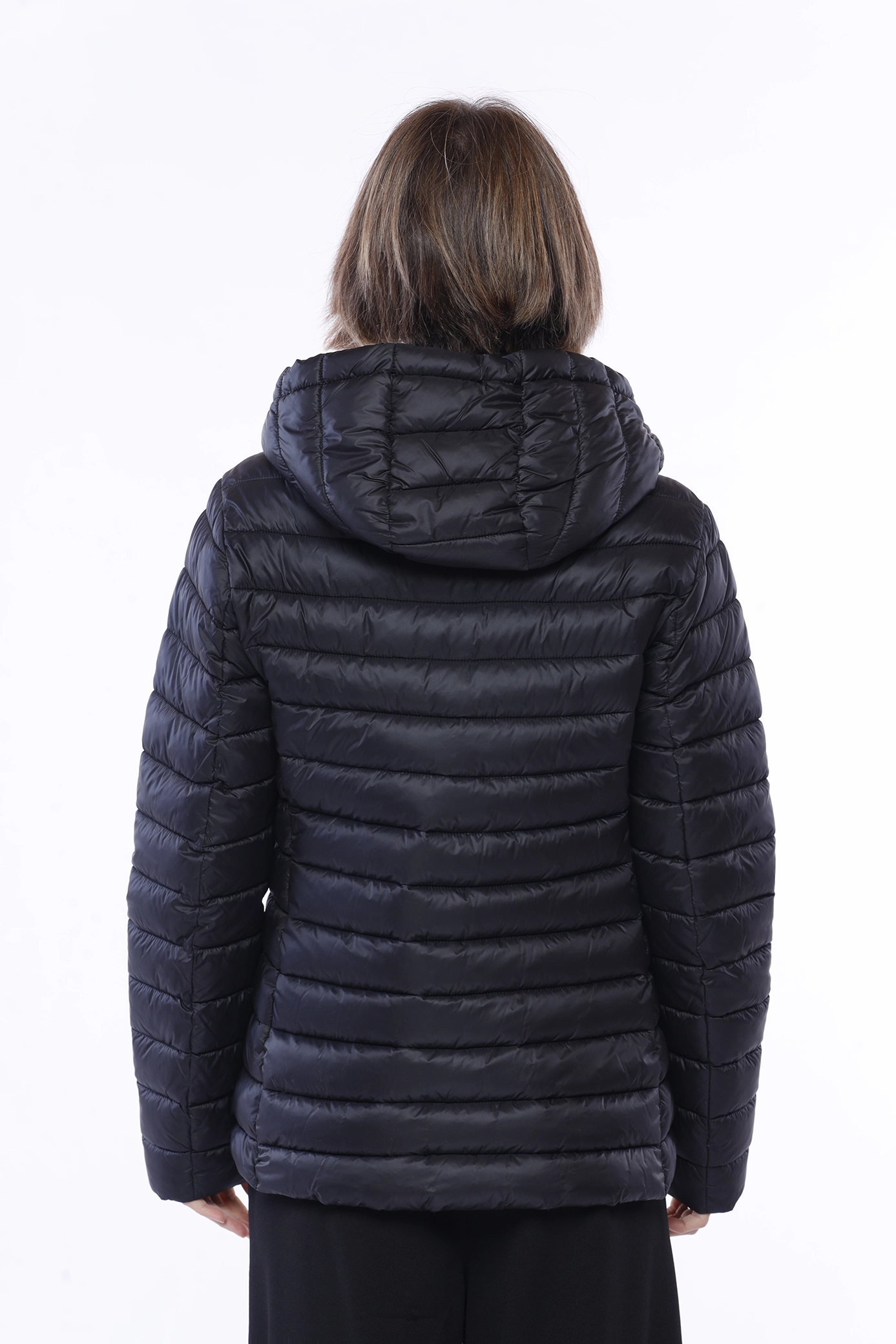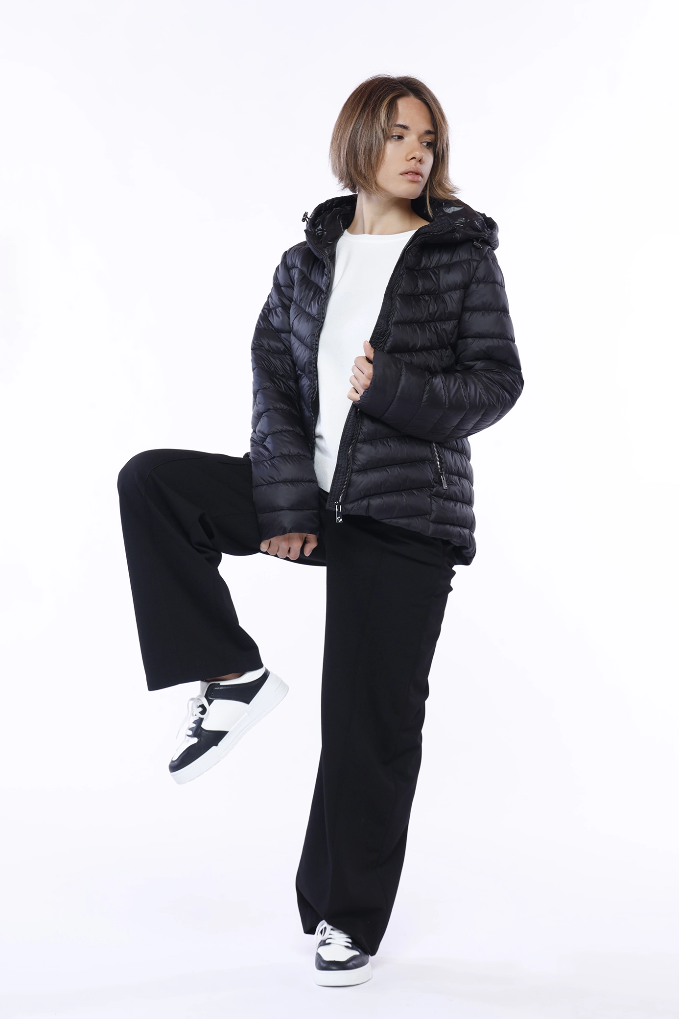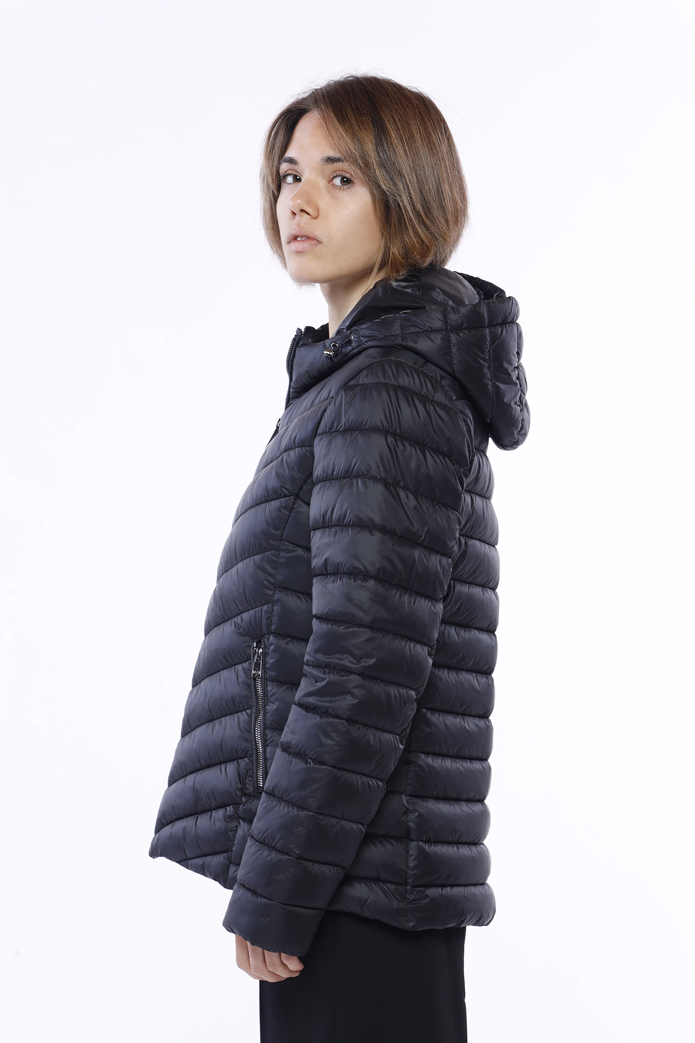Piumino corto trapuntato, con cappuccio regolabile da cordino elastico e tasche con cerniere metalliche