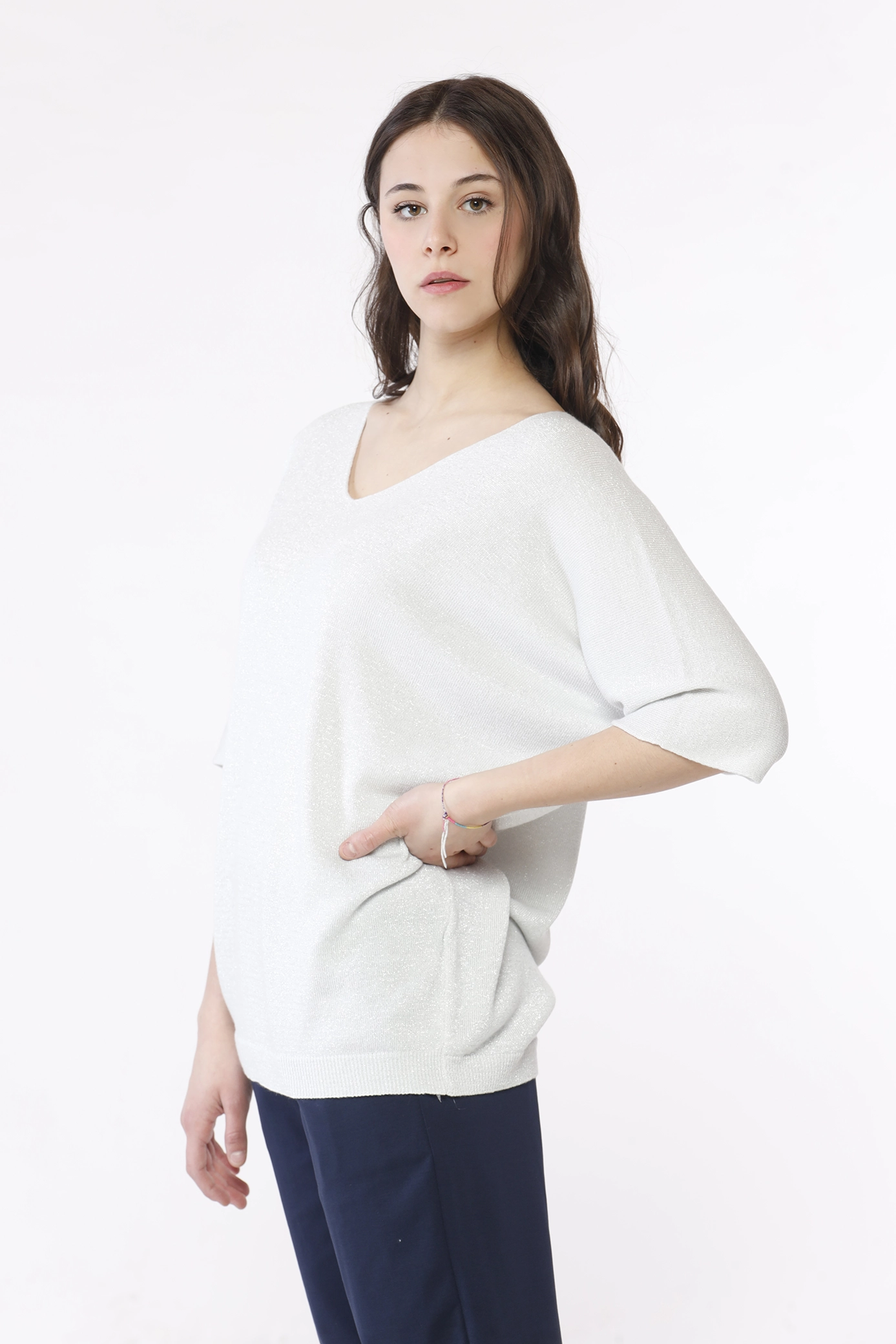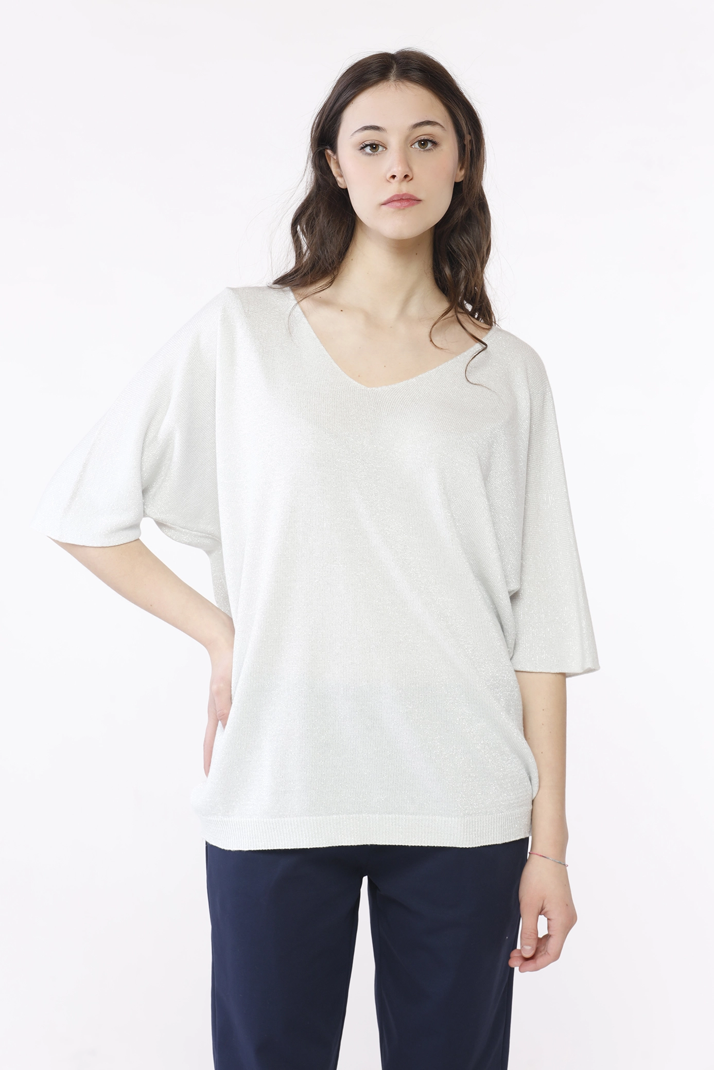 Maglia in modal laminata,con manica a tre quarti e scollo ampio
