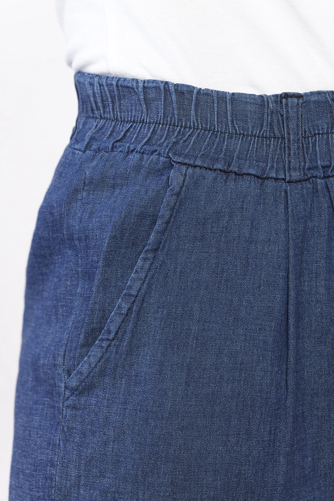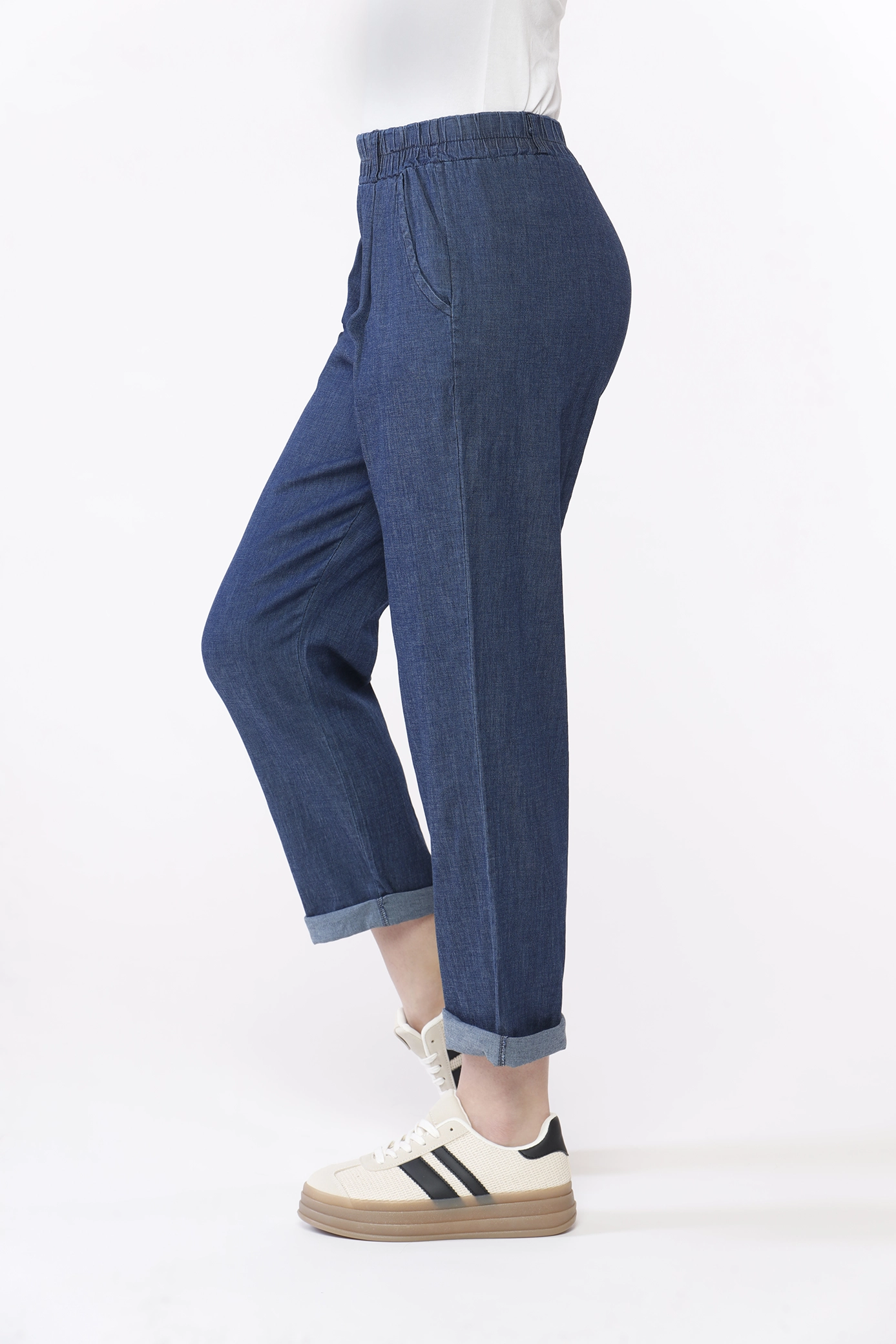 Pantalone dark denim, con risvolti alle caviglie, elastico arricciato in vita e comode tasche laterali