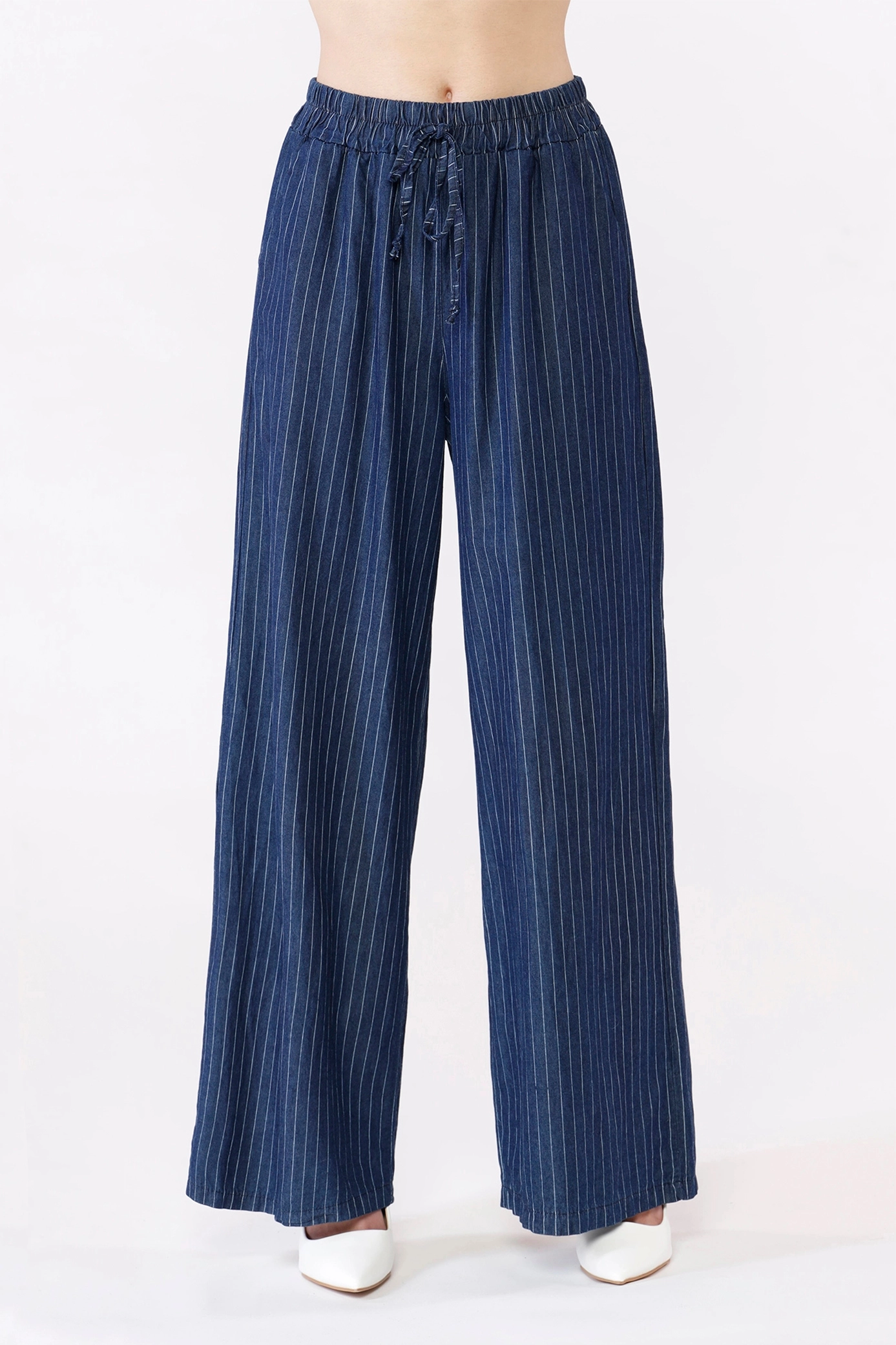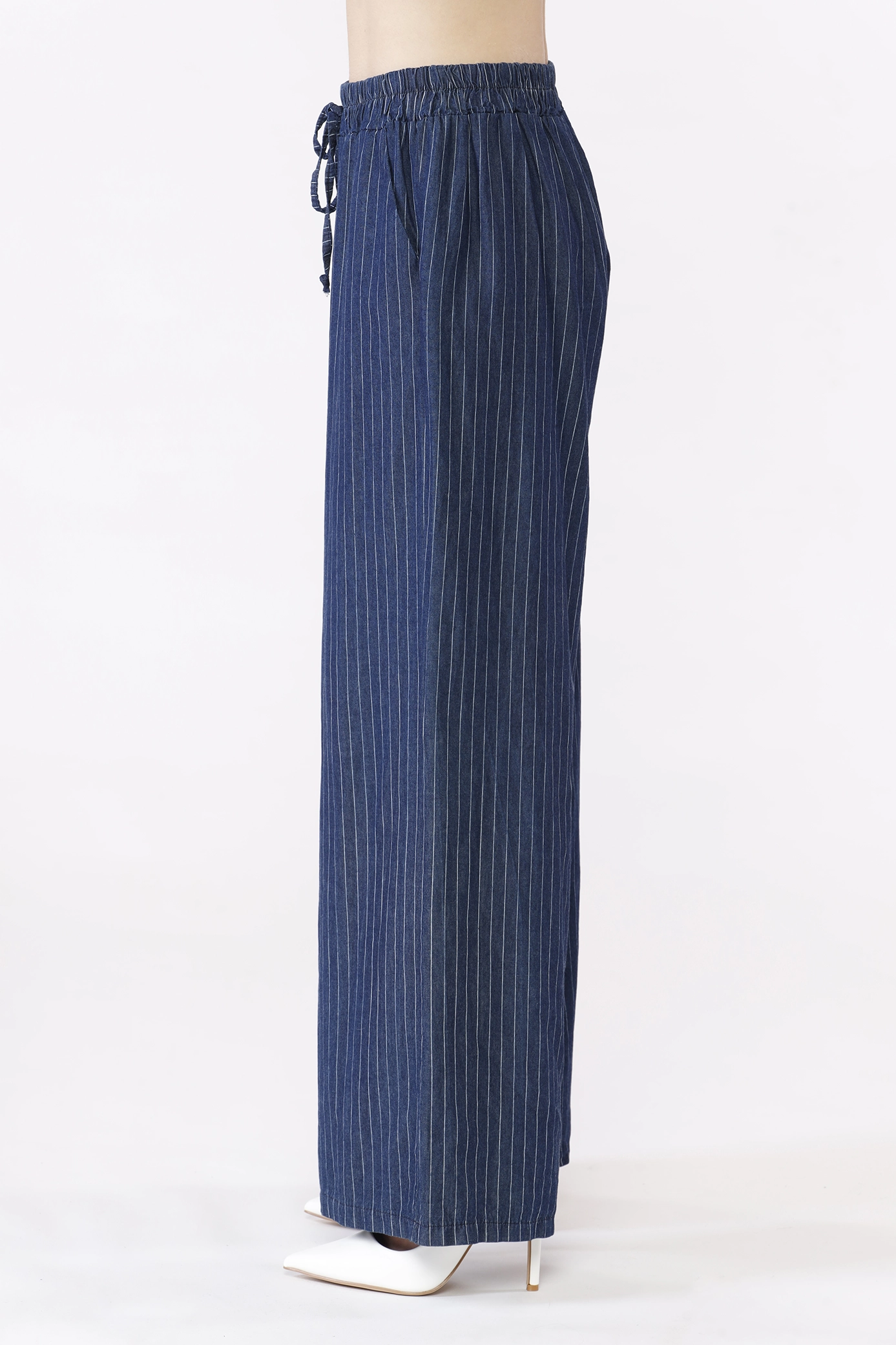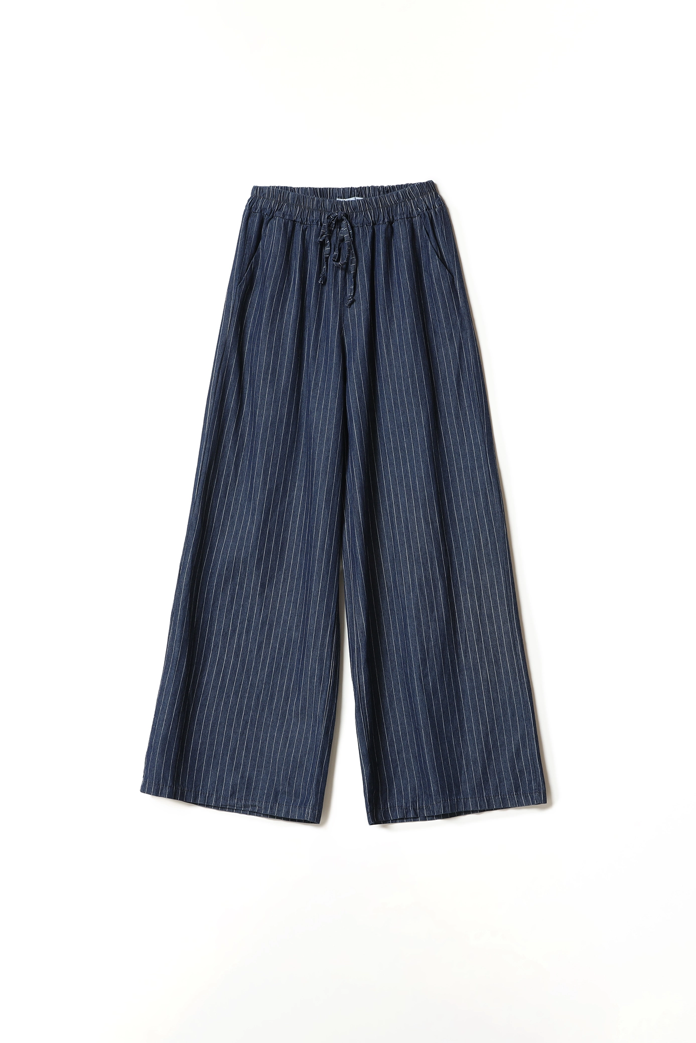 Pantalone in tencel rigato, dal taglio classico, con risvolti alle caviglie ed elastico in vita